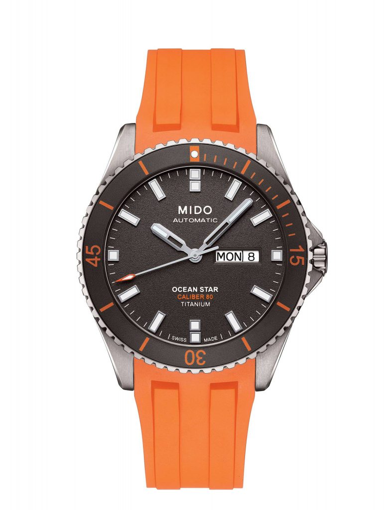Este año el color anaranjado de la correa de caucho del Ocean Star de Mido sobre sale, en conjunto con su caja de titanio, sin duda deportivo, pero a la vez una sorpresa por lo ligero que es, aún más al comprender que tan robusto es con este nuevo material en la marca.