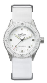 Un instrumento ideal para la práctica del submarinismo y actividades acuáticas, que evoluciona para ofrecerte específicamente lo necesario, no más, no menos, es decir: bisel unidireccional con sistema de seguridad; escala de medida concebida en Liquidmetal®, que junto a la cerámica garantizan la lectura y permanencia de la graduación debido a la composición química de la aleación, que además evitará cualquier deformación como resultado de los golpes o manipulación por causa de los agentes externos abrasivos; hermeticidad garantizada hasta por 300 metros; cristal de zafiro (por ambos lados) resistente a golpes y ralladuras; espiral de silicio antimagnética, que previene los efectos negativos del isocronismo y garantiza la frecuencia de 28,800 a/h con el paso del tiempo; pastilla luminiscente para sus indicadores y manecillas; caja de acero cepillado de perfil delgado, cómodo y ligero; finalmente, una correa realizada en NATO provista de tres presillas, que ofrecen un altísimo nivel de seguridad y adaptabilidad a la muñeca inclusive si coloca al Blancpain Bathyscaphe por encima del traje de neopreno.