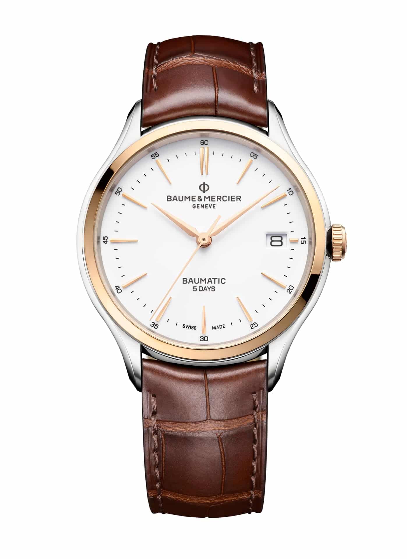 Clifton Baumatic está provisto por una caja de 40 mm de acero pulido y satinado y cristal de zafiro abombado. Cuenta con esbeltos índices ribeteados, finas agujas tipo lanza y gran fecha a las 3 en punto. Los modelos Clifton Baumati son herméticos hasta los 50 metros y en su fondo transparente permite admirar el calibre Baumatic BM12-1975A, movimiento mecánico automático realizado internamente por Baume & Mercier.