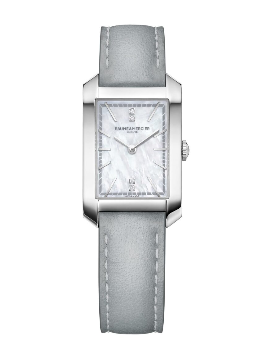 - Ref 10562: con bisel en acero inoxidable, carátula de nácar en tono blanco, índices engastados con diamantes y correa de piel de becerro azul hielo.