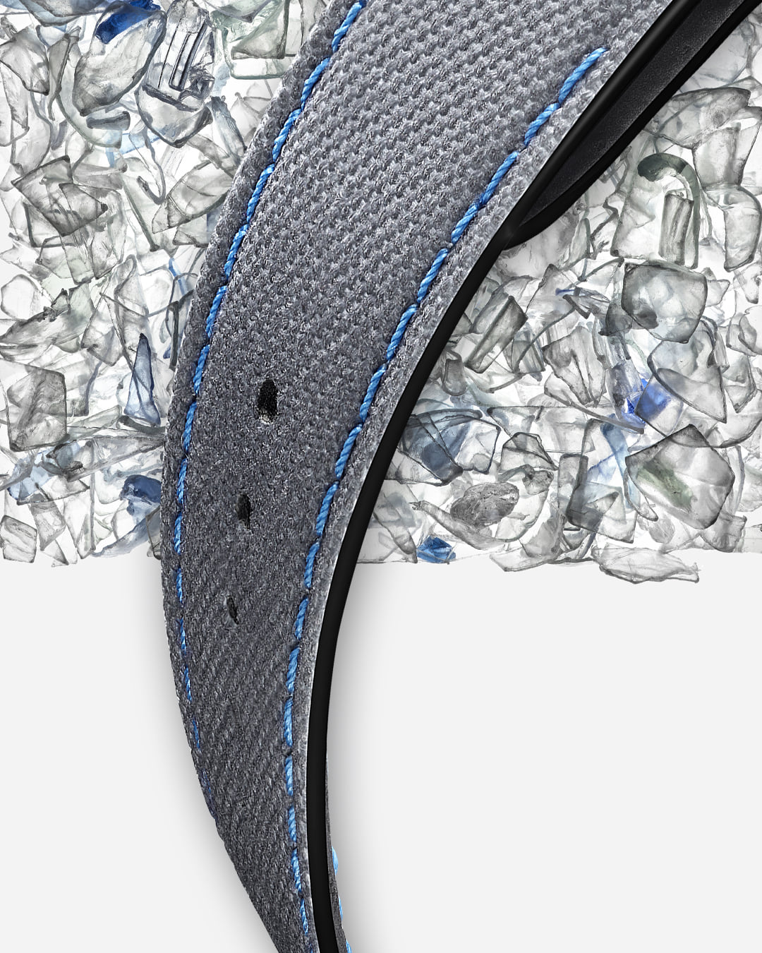 Está equipado con una correa intercambiable en un material llamado Seaqual® Yarn fabricado con plástico marino reciclado. La correa RPET gris presenta pespuntes azules o verdes, adornados con negro a lo largo del borde y forrada con corcho natural para mayor confort.
