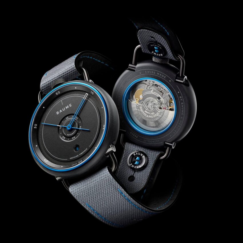 La pieza de Edición Limitada refleja el diseño que trajo el éxito de la colección Baume, con una corona descentrada –a las 12 en punto– en aluminio negro. La caja de 42 mm está fabricada con una tapa de plástico reciclado producida por la ONG WFO, albergada en aluminio anodizado azul o verde. El tapón está compuesto en un 80% de plástico reciclado reforzado con un 20% de fibra de vidrio para aumentar su resistencia.