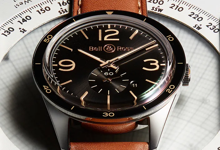 BR 123 Golden Heritage – Inspirado directamente en los relojes antiguos, esta pieza es una versión sofisticada del modelo 123 Sport Heritage, y fiel a los códigos estéticos. Caja de acero inoxidable pulido con bisel de aluminio negro graduado con 60 minutos y carátula negra con números árabes a fin de garantizar la visibilidad perfecta. Se abraza mediante una correa de piel de becerro gold.