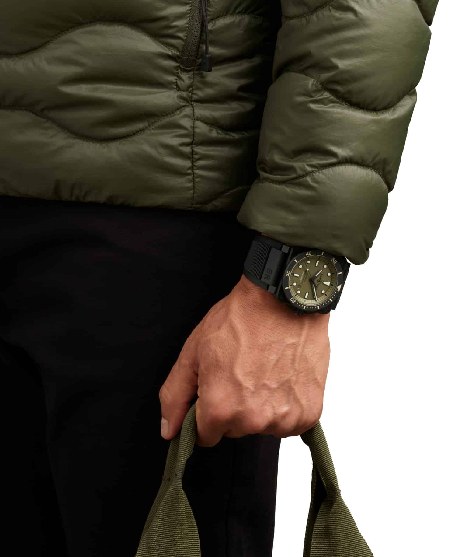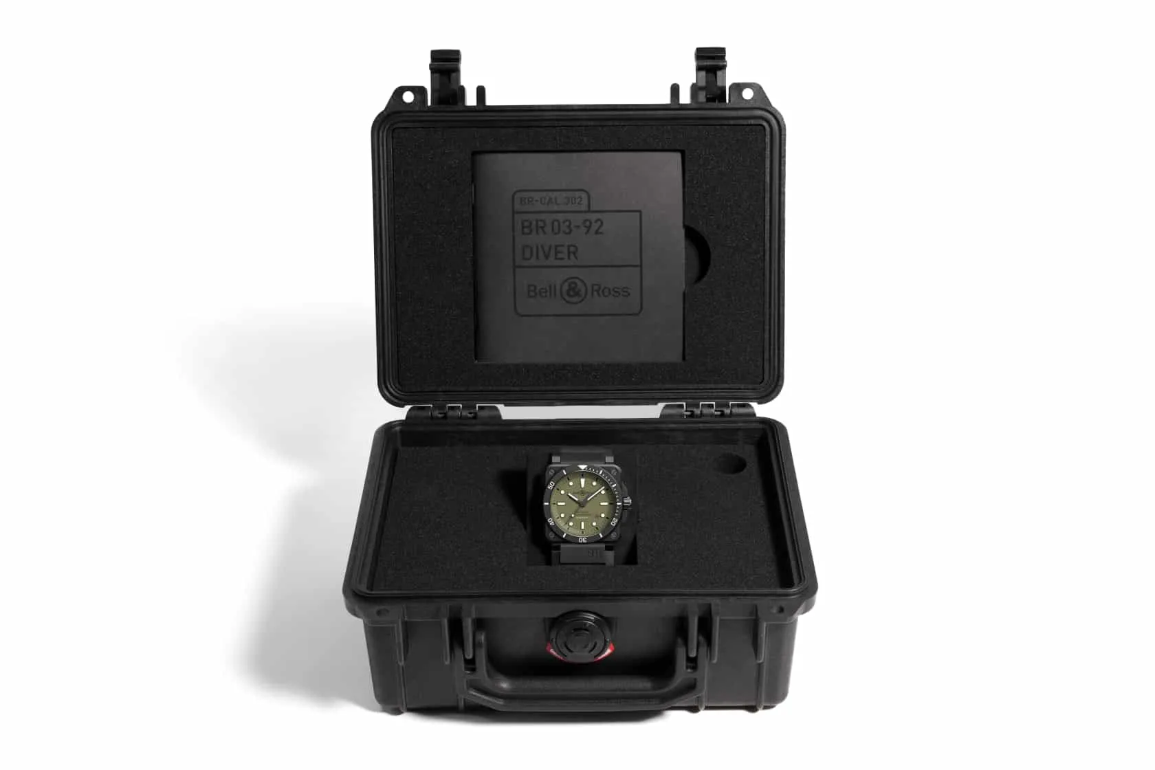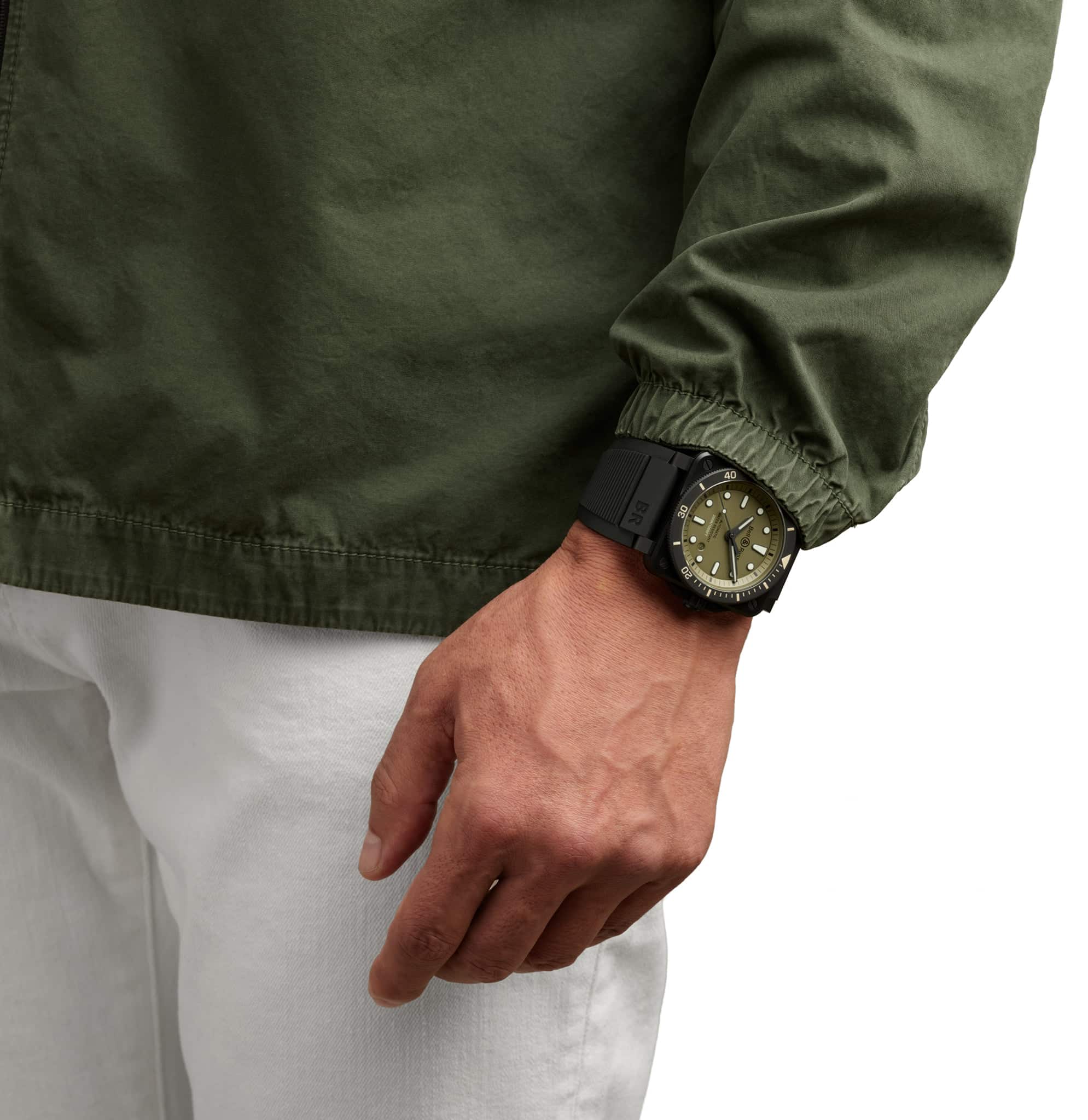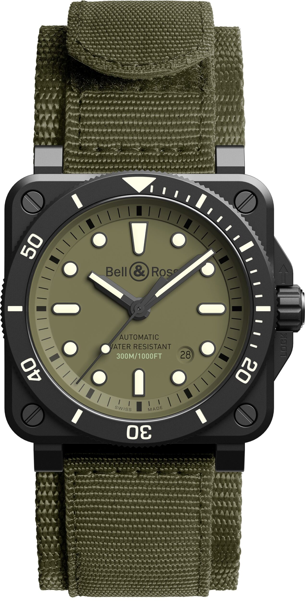 Bell & Ross BR 03-92 Diver Military es la más reciente adición de la marca a la línea de relojes profesionales de buceo bajo los estándares de la norma ISO 6425. La pieza se presenta en fabricación cerámica para caja, bisel y corona, un material de alta tecnología que garantiza máxima resistencia a los arañazos, corrosión y demás agentes abrasivos naturales del mar o las condiciones a las que será expuesto. Pero que también ofrece un look excepcional, mate, robusto y que apela a la historia de la marca y su inspiración militar.