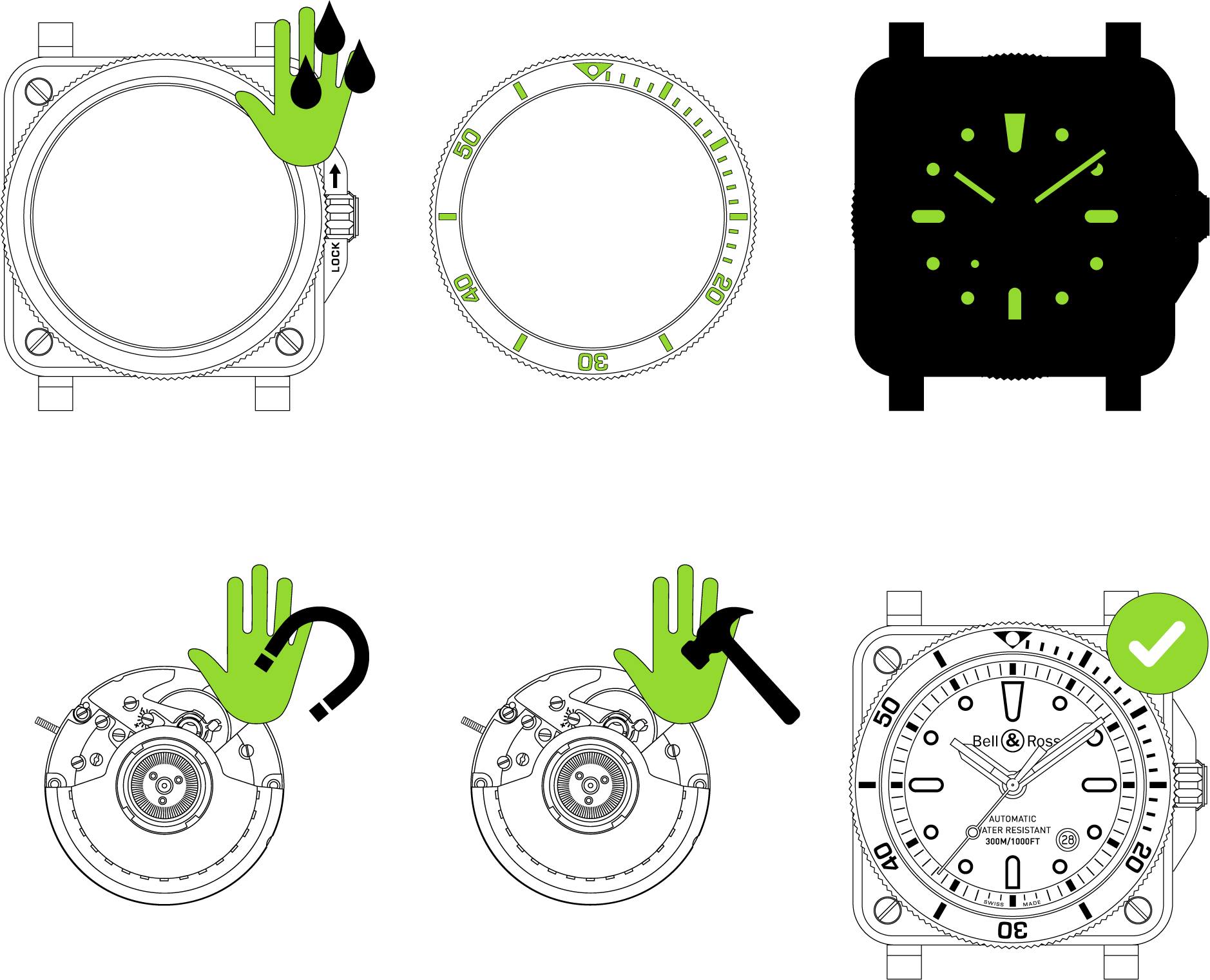 - Resistencia: hermeticidad garantizada a 300 metros, gracias a una fabricación interior en acero, “forrada” por cerámica negra mate. El cristal de zafiro de 2.85 mm es prácticamente del doble de grueso que el de un reloj tradicional, mientras que la corona a rosca está recubierta con caucho, a fin de mejorar la resistencia a los impactos.