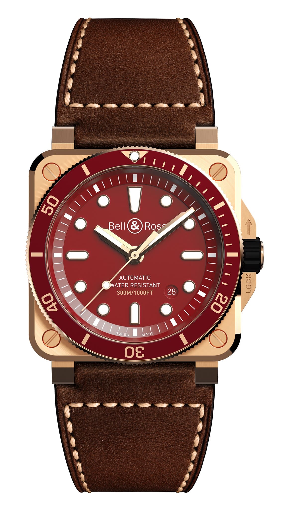 Disponible en una edición limitada de 999 unidades, el BR 03-92 Diver Red Bronze luce el emblema del reloj, un casco de buceo, que está grabado en el fondo de la caja. Precioso pero resistente, el BR 03-92 Diver Red Bronze está lleno de carácter y está diseñado para acompañar al hombre aventurero, tanto en tierra como en el mar.