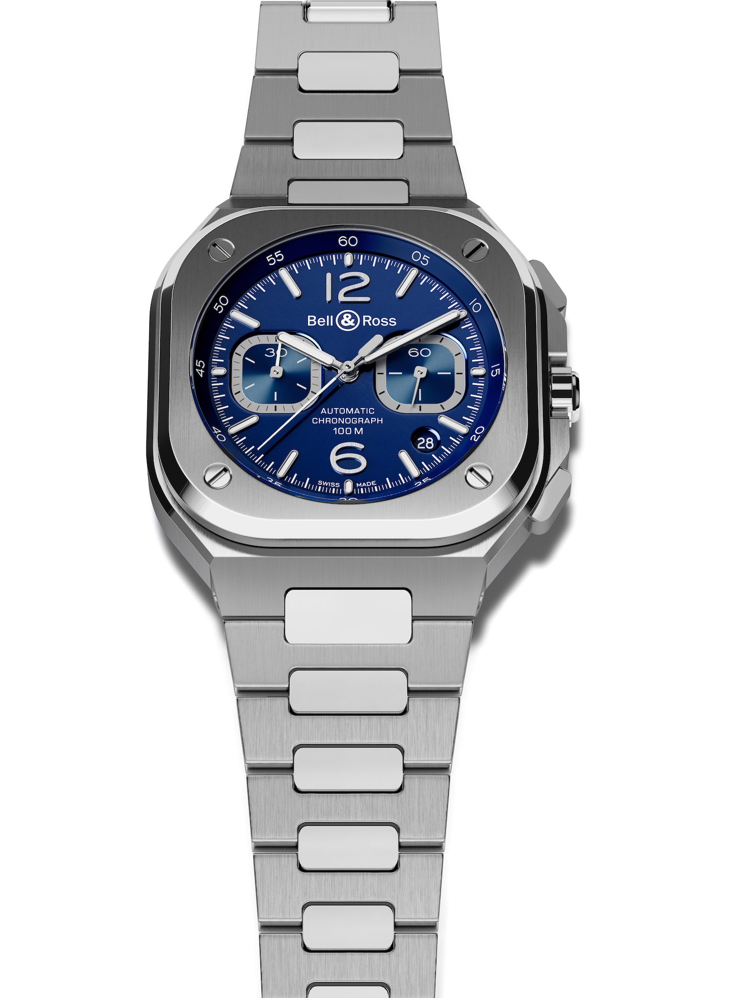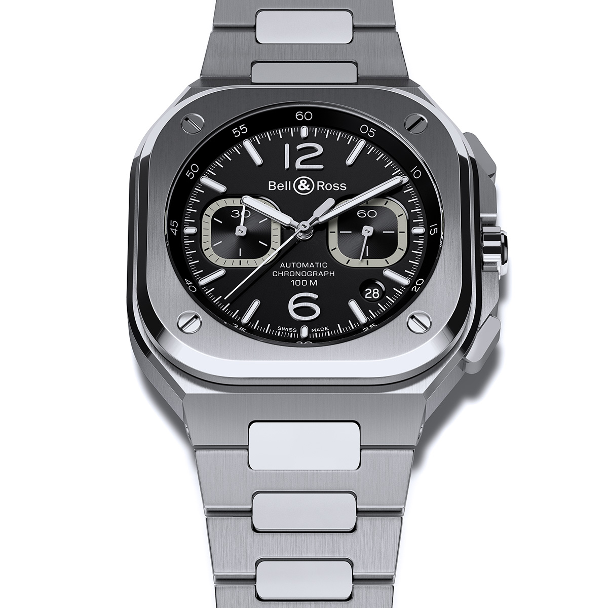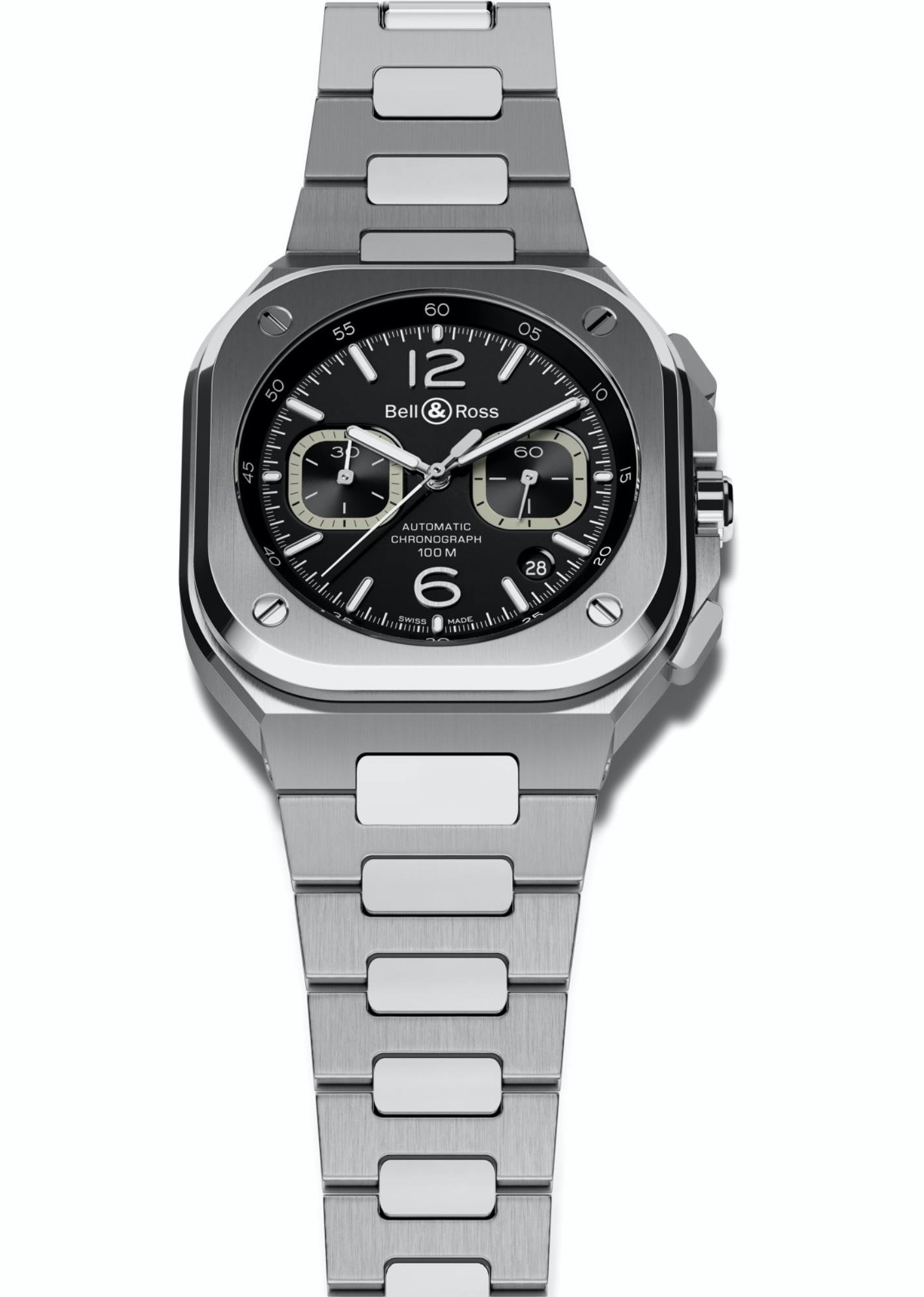 Los elegantes acabados de BR 05 Chrono llaman la atención, comenzando por su caja de 42 milímetros. Las superficies con acabado satinado son completamente planas, mientras que el bisel pulido enfatiza y mejora su superficie volumétrica, que alterna con acabados satinados y pulidos, los cuales también se encuentran en la pulsera de acero notablemente flexible.