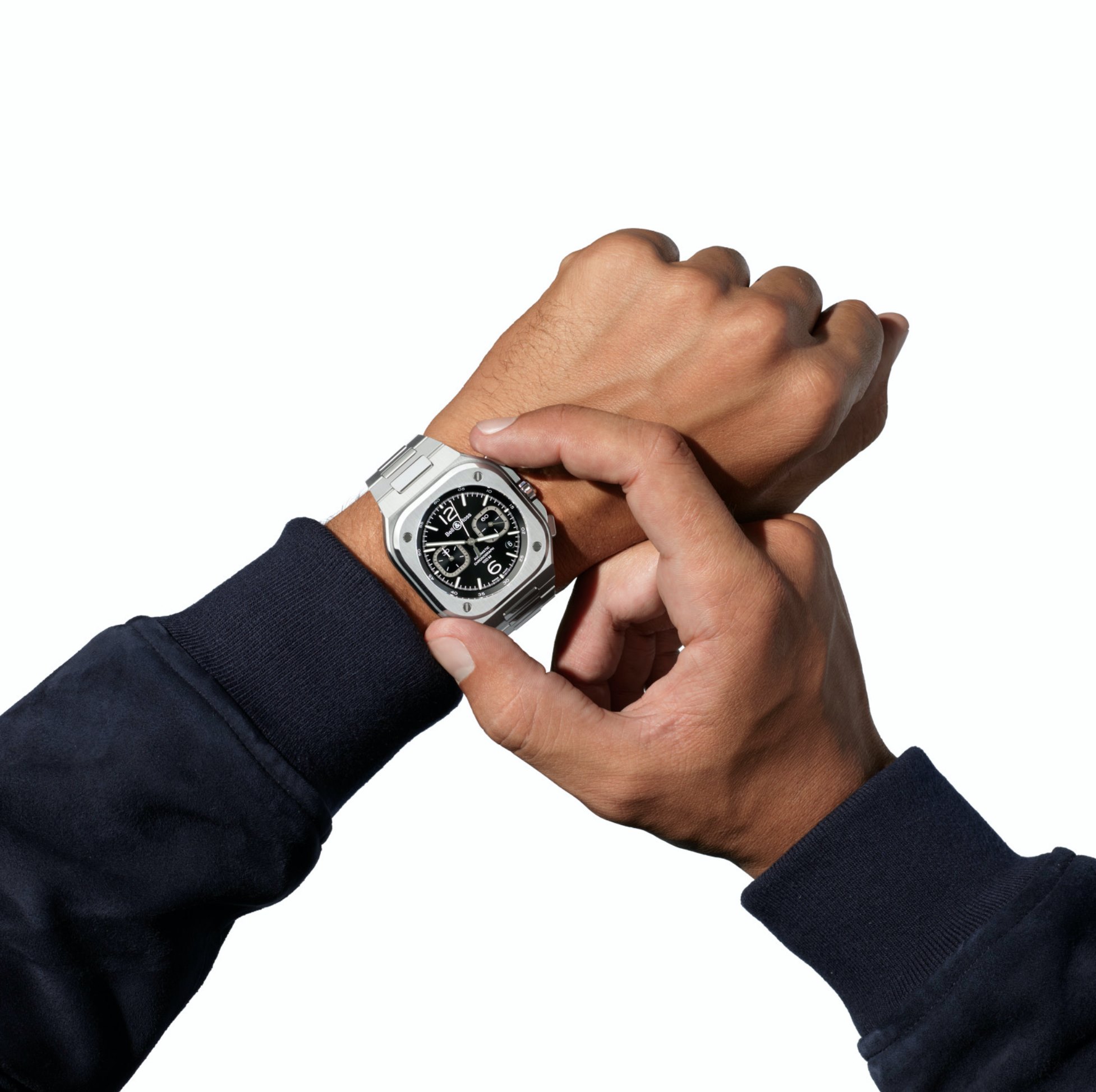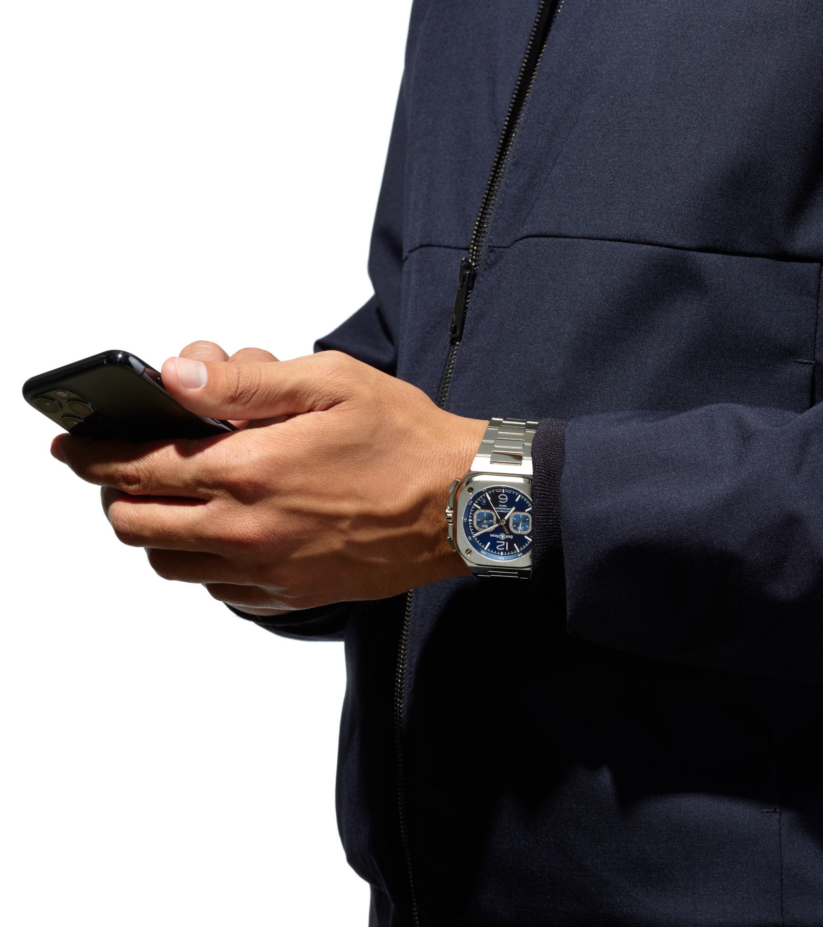 “Esta integración de la caja y el brazalete no solo está en línea con la identidad visual de la marca, sino que también aporta otra dimensión al reloj. El primer enlace forma parte de la caja, este tipo de diseño se remonta a los años 70, y cuando se traslada a Bell & Ross, da un resultado con un estilo gráfico que es a la vez llamativo y moderno”. Bruno Belamich, Cofundador y Director Creativo de Bell & Ross.