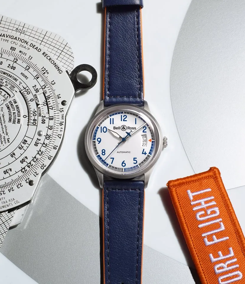 Los números, el bisel, el contador del cronógrafo y la correa son azules, al igual que la cola y los elementos decorativos que marcan las líneas aerodinámicas del BR-Bird. La segunda aguja central, los detalles de la carátula y el revestimiento de la correa de cuero son naranja, el color con que se destaca la información más relevante en los instrumentos de vuelo. El contador es gris, para evocar las banderas de cuadros que se usan en las competencias de velocidad, y como el logo de Bell & Ross en las alas y los laterales del avión.