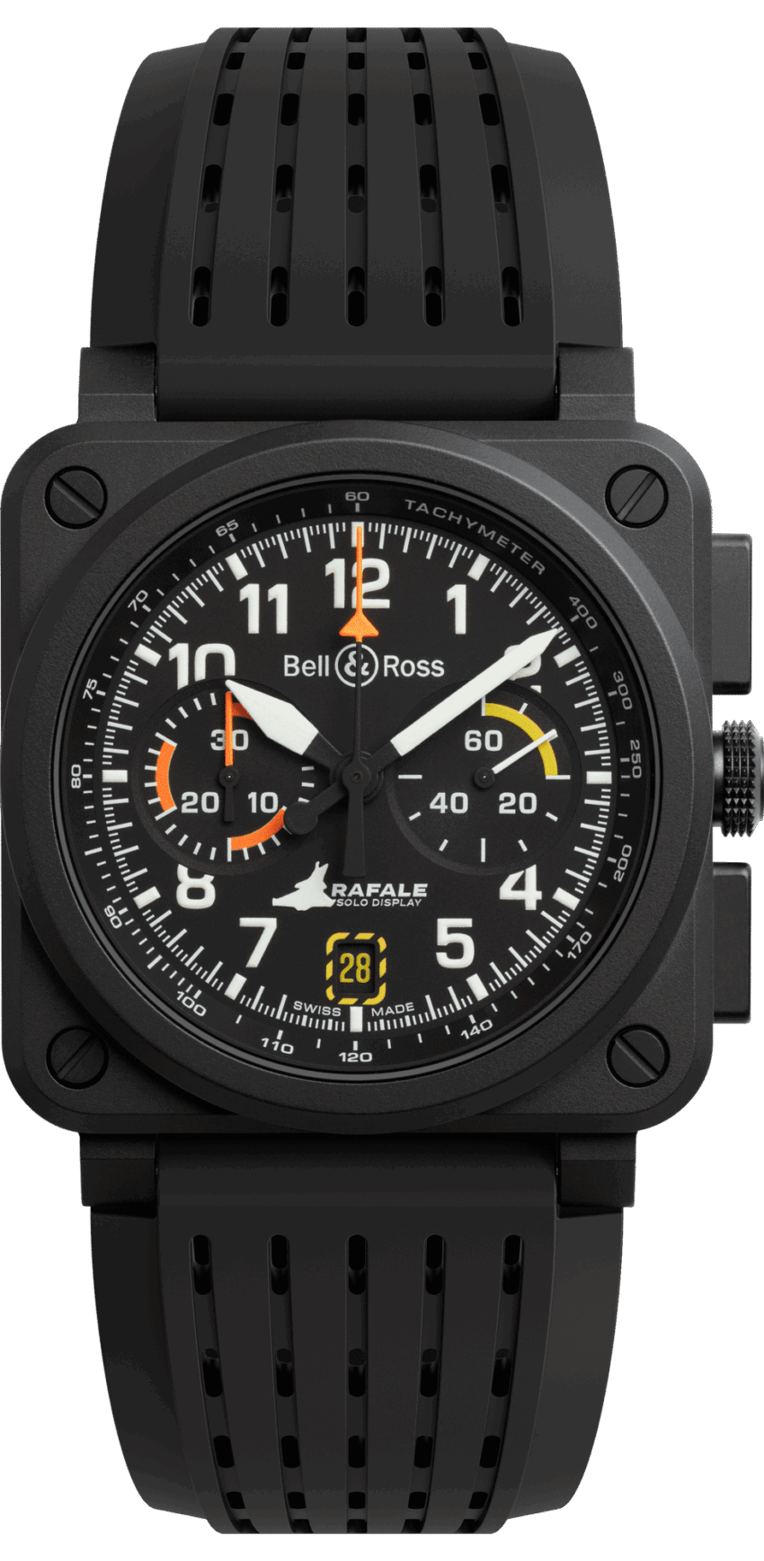 Símbolo de poder tecnológico y excelencia, la pieza se ha diseñado para los pilotos del Rafale y los apasionados de la aviación de élite. Bell & Ross Chrono Rafale Solo Display se presenta como una edición limitada de 500 piezas. Monta el calibre automático BR-CAL.301 con 42 horas de reserva de marcha. Un cronógrafo con segundero central y el contador de los 30 minutos en las 9 h. La caja de 42 mm está fabricada en cerámica negra pulida con chorro de arena.