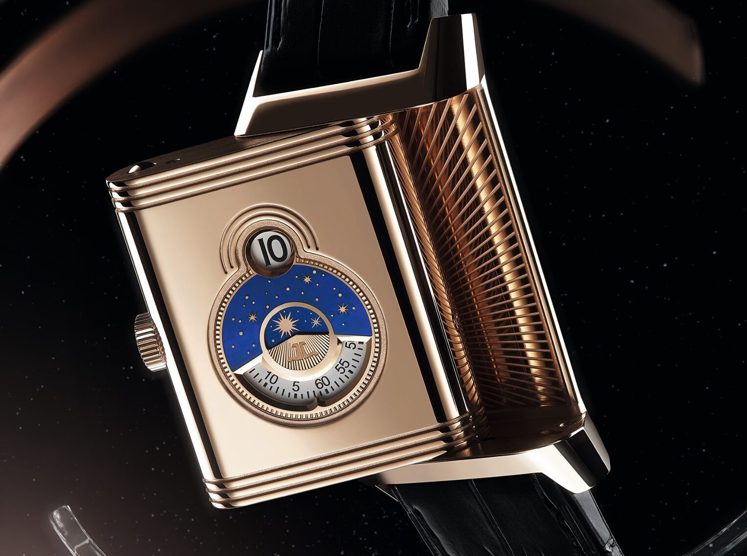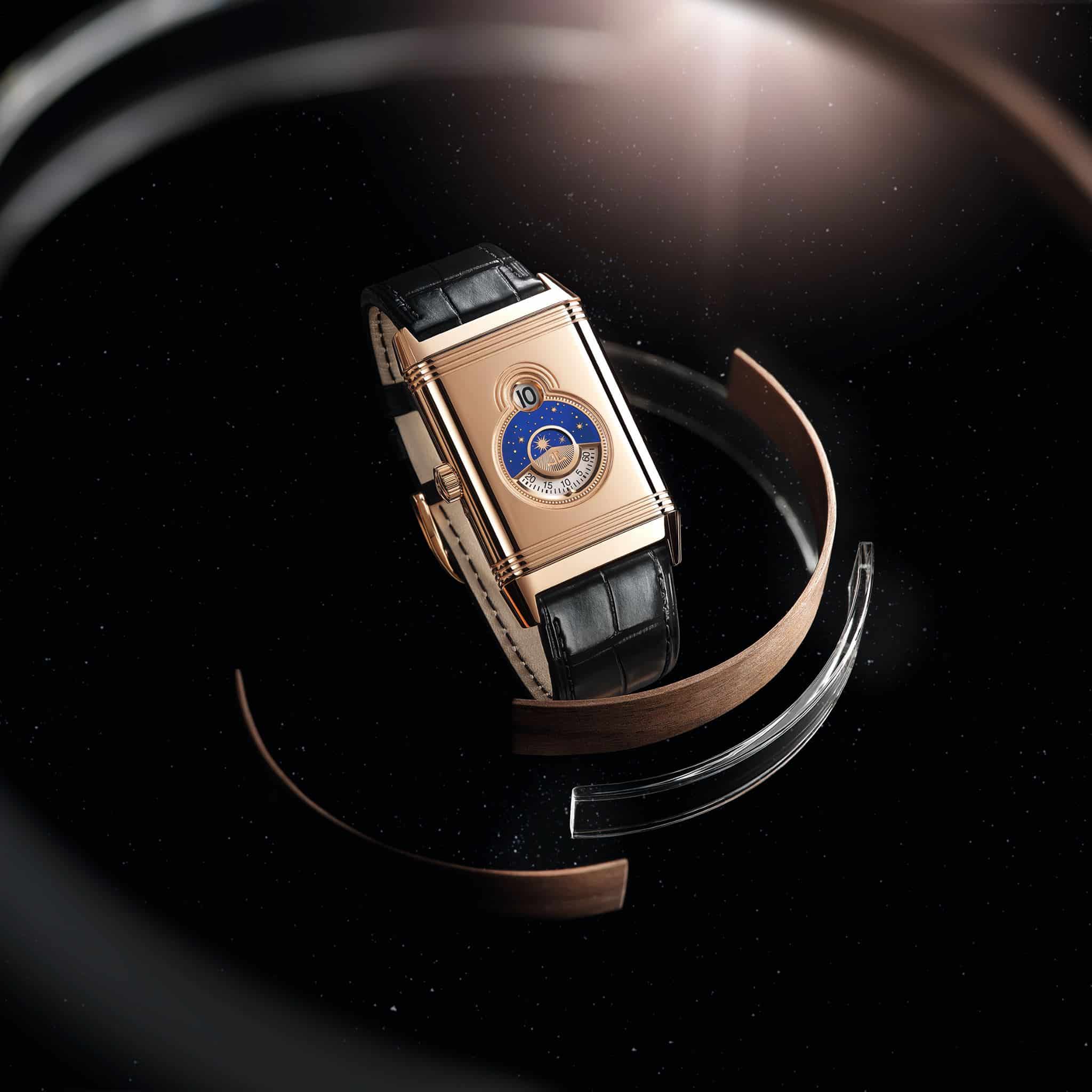 El reloj expresa maravillosamente la atención a los detalles y las habilidades artesanales que residen dentro de Jaeger-LeCoultre. En el reverso, un disco lacado en azul intenso ha sido salpicado de diminutas estrellas doradas para representar el cielo nocturno, y al cruzarlo, una luna y un sol grabados a mano indican la noche y el día.