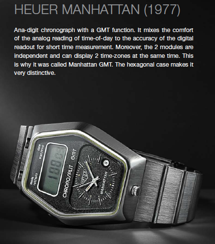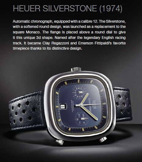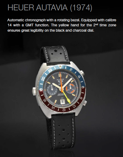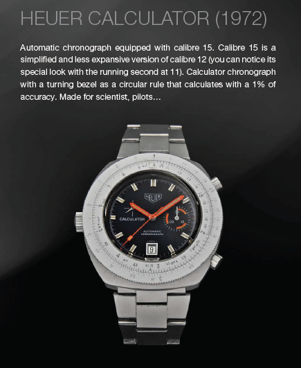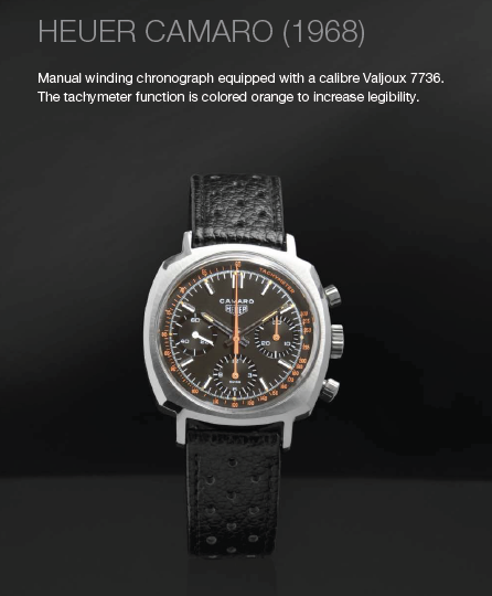 La selección de relojes incluye un Carrera original de 1965, diseñado específicamente para conductores y entusiastas de los deportes. Además del Calibre 12 Carrera de 1970 con una pulsera de acero inoxidable. Otras piezas notables incluyen los modelos Autavia de 1968, 1970 y 1974, el Camaro de 1968, el Mónaco de 1970 y 1975, el Manhattan de 1977 y el Calculator de 1974, entre muchos otros.
