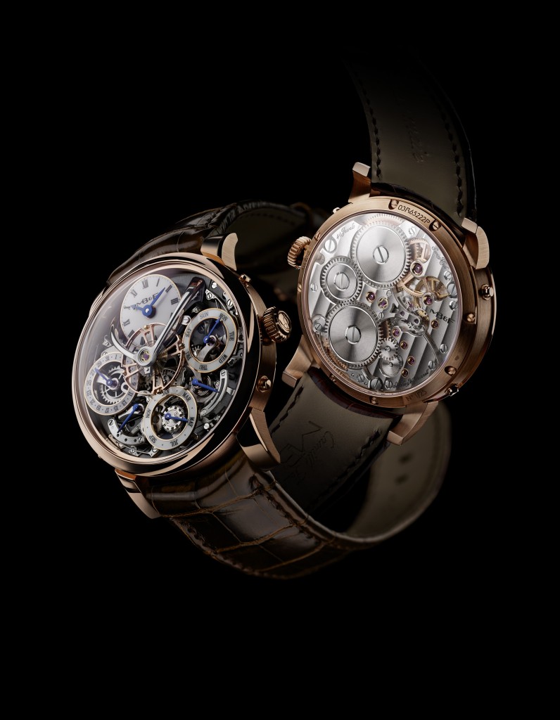 El mérito es tremendo, ya que incluir un enorme torbellino, cronógrafo flyback y calendario perpetuo con fase Lunar requería de talento y miniaturización mecánica. Es un movimiento completamente nuevo, cuya reserva de energía ha sido ampliada de 36 a 50 horas de reserva de marcha. El torbellino se mira únicamente desde el fondo de la pieza, mientras que el sistema de cronógrafo se ubica en la parte superior. El tourbillon cuenta con sistema de parada de segundero a fin de poder realizar un ajuste con seguridad y extrema precisión. Finalmente, la indicación de la reserva de marcha es lineal y parte de las 9 a las 10:20 horas mediante dos tonalidades: blanco y rojo, mientras que el corrector –en punto de las 10 h– permite ajustar las funciones del calendario a medida de un salto por pulsación.