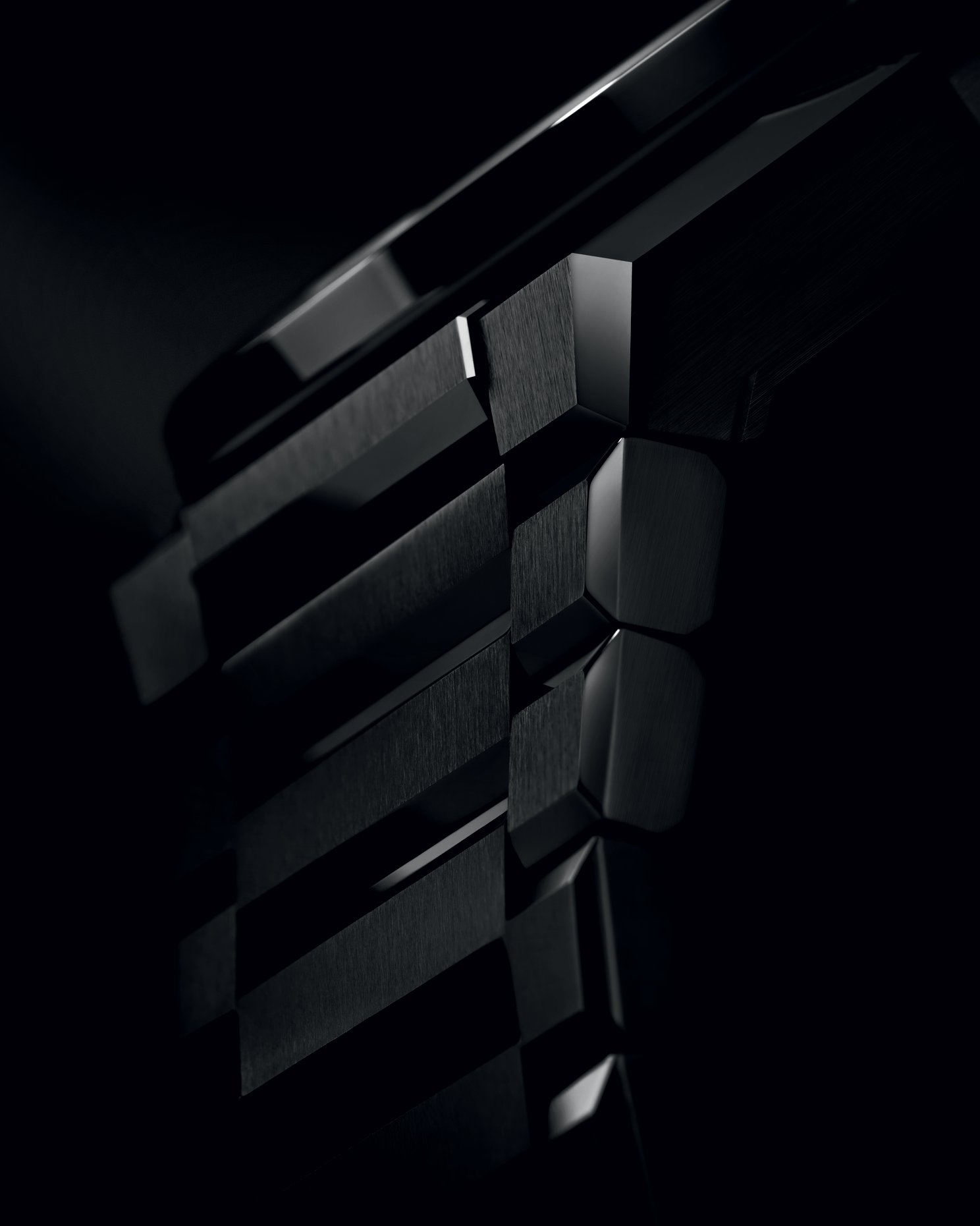 Tres mallas, una central y dos laterales, Sigue un marcado estilo que retoma los códigos de la caja, con aristas que evocan no solo la estética de los pulsadores, sino también la arquitectura bien definida de la carrura. Tanto los acabados pulidos-satinados como el angulado y biselado de los eslabones inducen el mismo efecto de profundidad y de contraste entre caja y luneta de bisel.