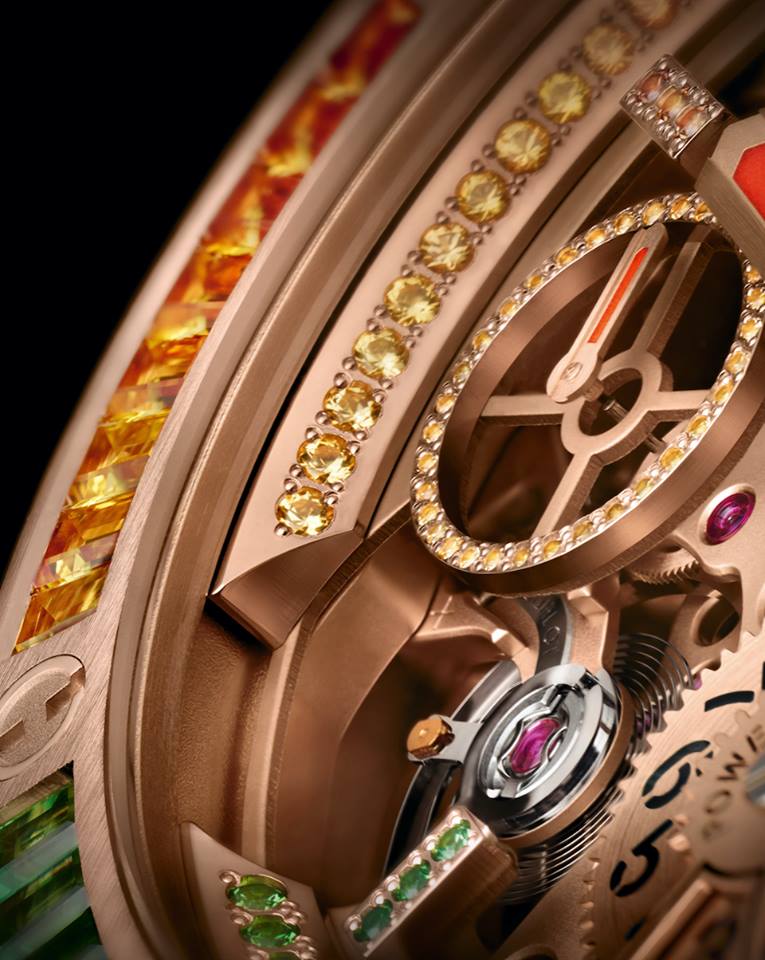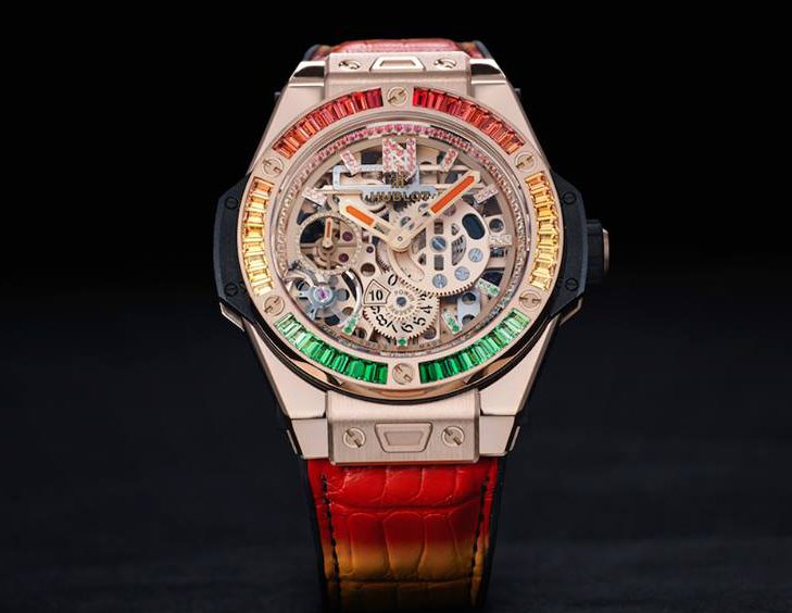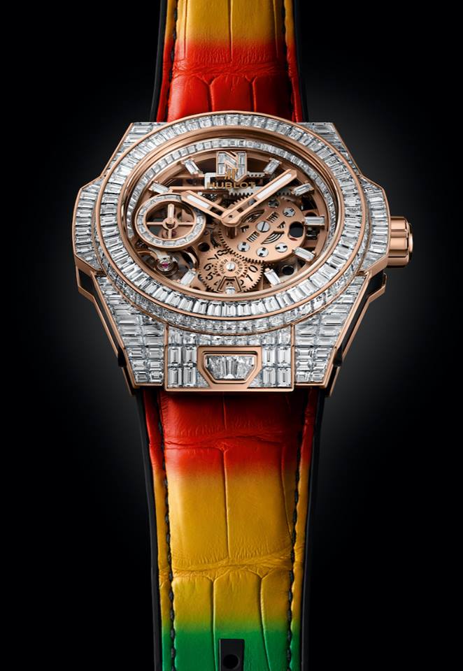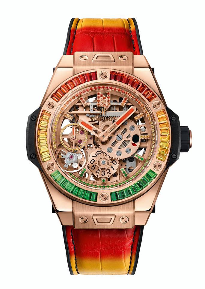 Para los amantes de los colore, la segunda opción del Big Bang Meca-10 Nicky Jam los conquistará. Pues esta pieza está hecha de colores cálidos que combinan a la perfección con las aleaciones de oro, cobre y platino. Además, el engaste de piedras preciosas como: zafiros amarillos, naranjas y tsavoritas le dan un aspecto único.