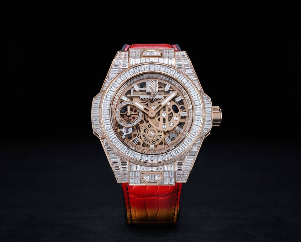 Por último, la última pieza de esta gama incorpora en su caja King Gold diamantes baguette alrededor del bisel. Más de 307 diamantes con un peso de 16,9 quilates, son los que habitan en este modelo. Dependiendo de la versión, estos relojes se ajustarán a través de un brazalete en piel de caimán de color rojo, amarillo y verde con pespunteado negro sobre caucho negro o por una correa de alcantara negra y caucho negro con costuras negras.