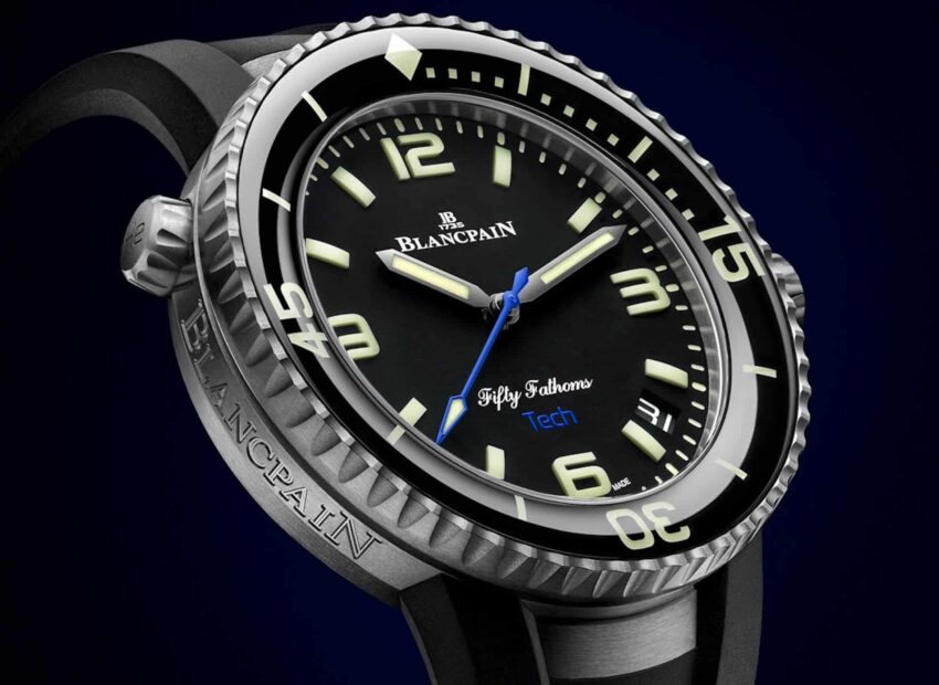 Sin perder los principios más puristas del Fifty Fathoms, la esfera negra absoluta garantiza una legibilidad óptima bajo el agua, pero ahora el diseño de los índices está formado por bloques aplicados luminiscentes en relieve. La correa integrada de caucho negro, combinada con las asas centrales fijadas desde el interior de la caja, proporciona una ergonomía excepcional. En la carátula se puede leer “Tech” en azul como distintivo de una pieza concebida funcionalmente.