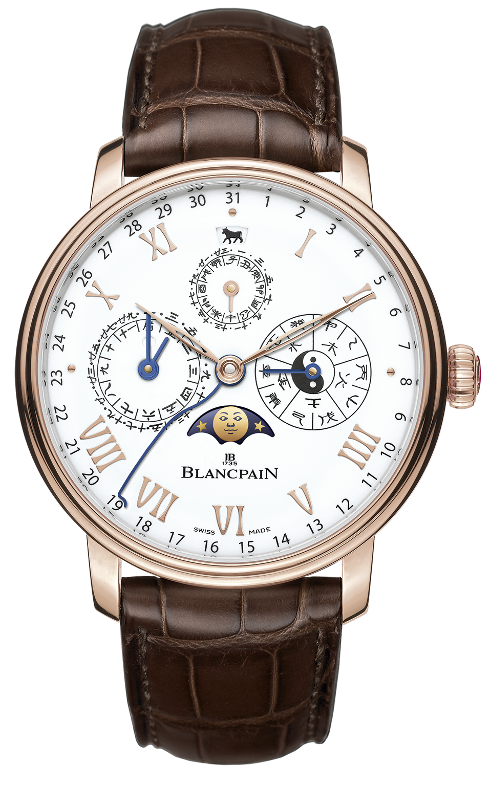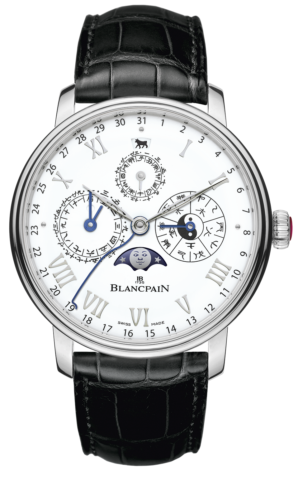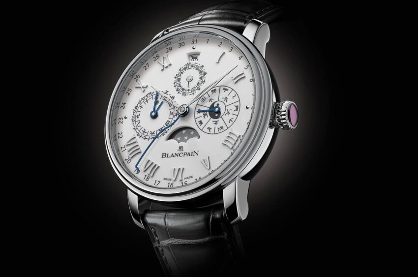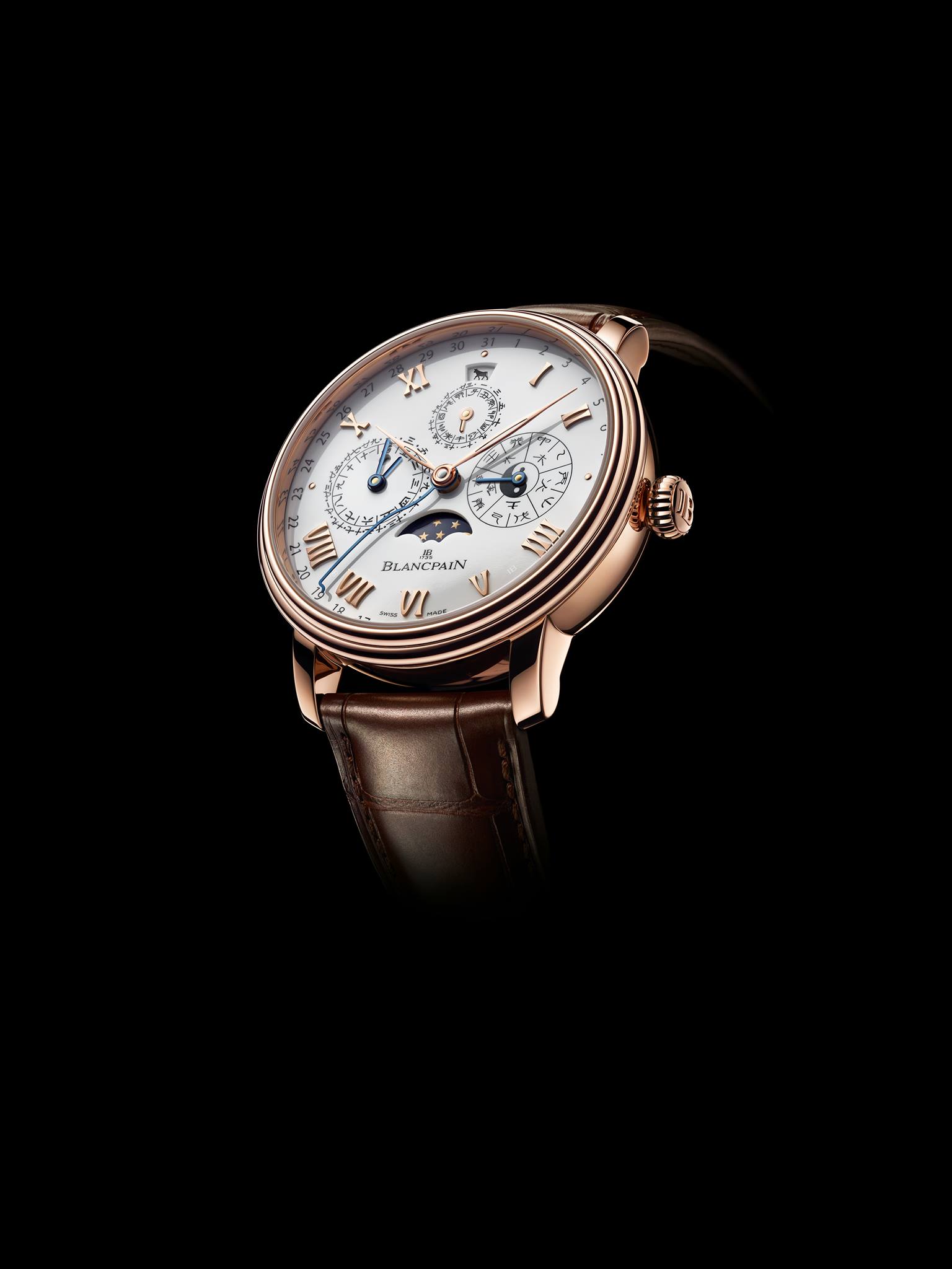 Por si fuera poco, las fases de Luna –elemento clave de los calendarios perpetuos de Blancpain– se encuentran presentes mediante una abertura en la carátula, y desempeñan un papel preponderante dada la vinculación entre el ciclo lunar y los meses chinos tradicionales.