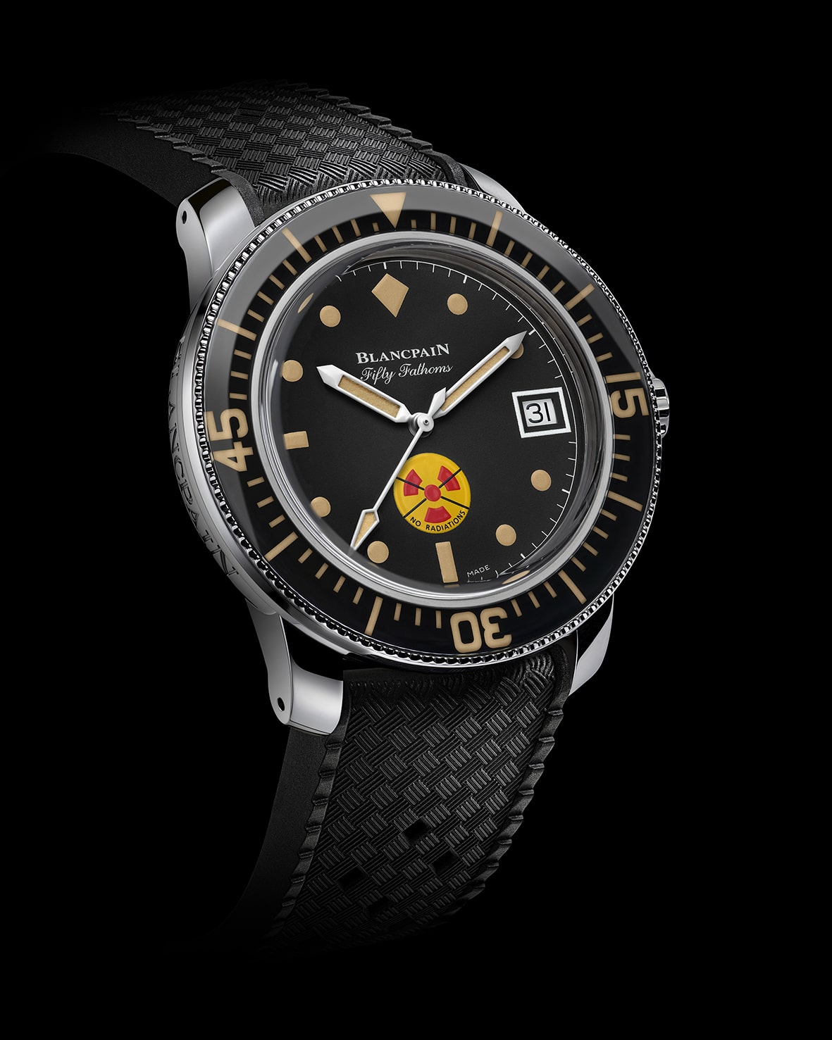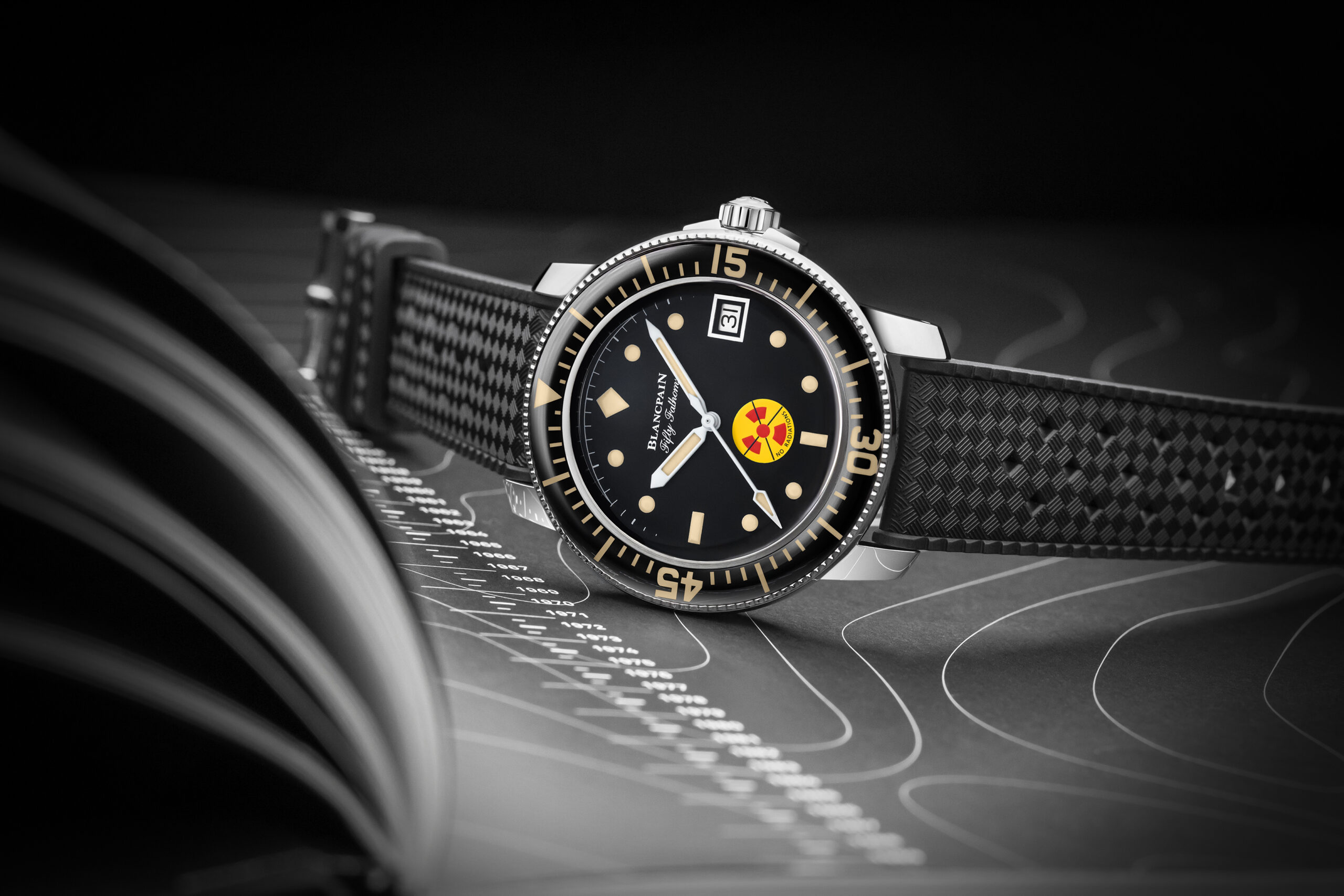 A principios de los años sesenta, el radio, un elemento radioactivo utilizado en relojería por sus propiedades luminiscentes, es declarado perjudicial para la salud. Para tranquilizar a los buzos profesionales, así como a los aficionados experimentados que compran sus relojes Fifty Fathoms a proveedores de equipos especializados, Blancpain decide indicar claramente que sus relojes no contienen radio – por lo tanto, son inofensivos – añadiéndoles un símbolo especial: tres segmentos rojos sobre fondo amarillo tachados con una cruz negra. Las palabras “no radiations” inscritas debajo del logo garantizan una clara comprensión del mensaje. Más adelante, se incluirá este signo en el modelo Fifty Fathoms RPGA 1, una versión del BUND No Rad con calendario, en el cual se mantendrá como el criterio principal.