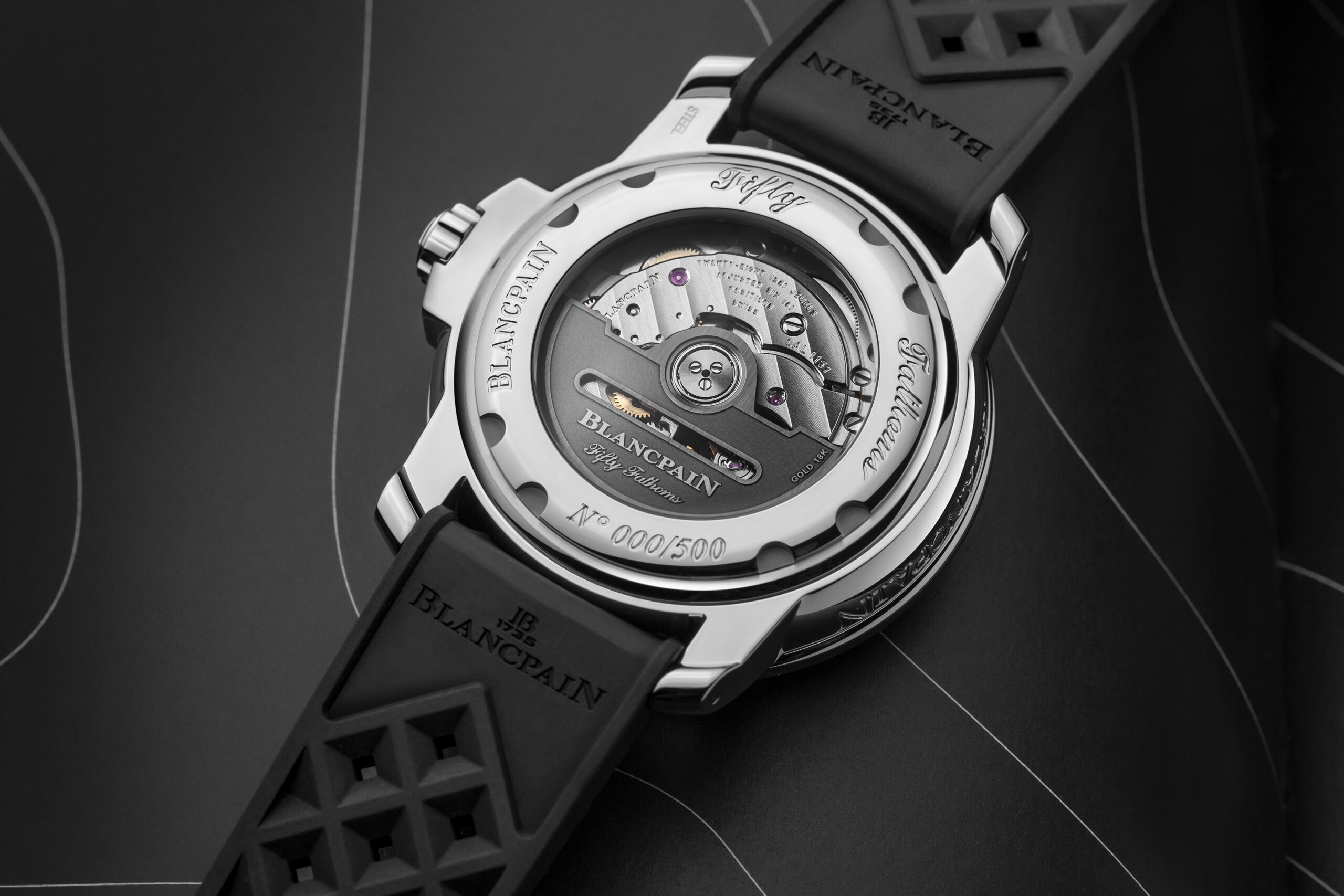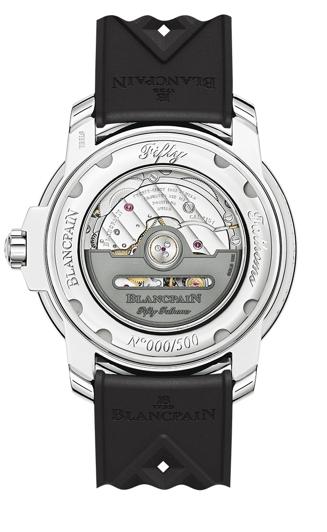 Alberga el calibre Blancpain 1151, un movimiento con cuerda automática equipado de una espiral de silicio que ofrece 4 días de reserva de marcha. El remonte de sus dos barriletes se efectúa mediante un rotor dotado de una abertura en forma de cartucho, un guiño a algunos relojes históricos de la colección, como el primer Fifty Fathoms. Poco común actualmente, este detalle antes era utilizado para flexibilizar la masa oscilante y proteger así el movimiento contra posibles golpes. Este modelo posee una correa de caucho de tipo “Tropic”, un material muy popular entre los buzos de la época debido a su resistencia al desgaste y su comodidad de uso.