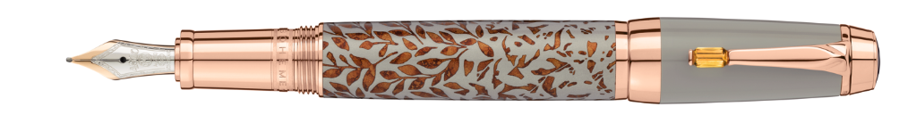 Artículo de escritura: Montblanc Bohème Doué Moongarden captura la atmósfera del otoño mediante un cuerpo metálico lacado en tonalidad gris franela, además de presentar un follaje incrustado con laca color rojo y dorado, que emula el volar del mismo a través de los vientos de la estación.
