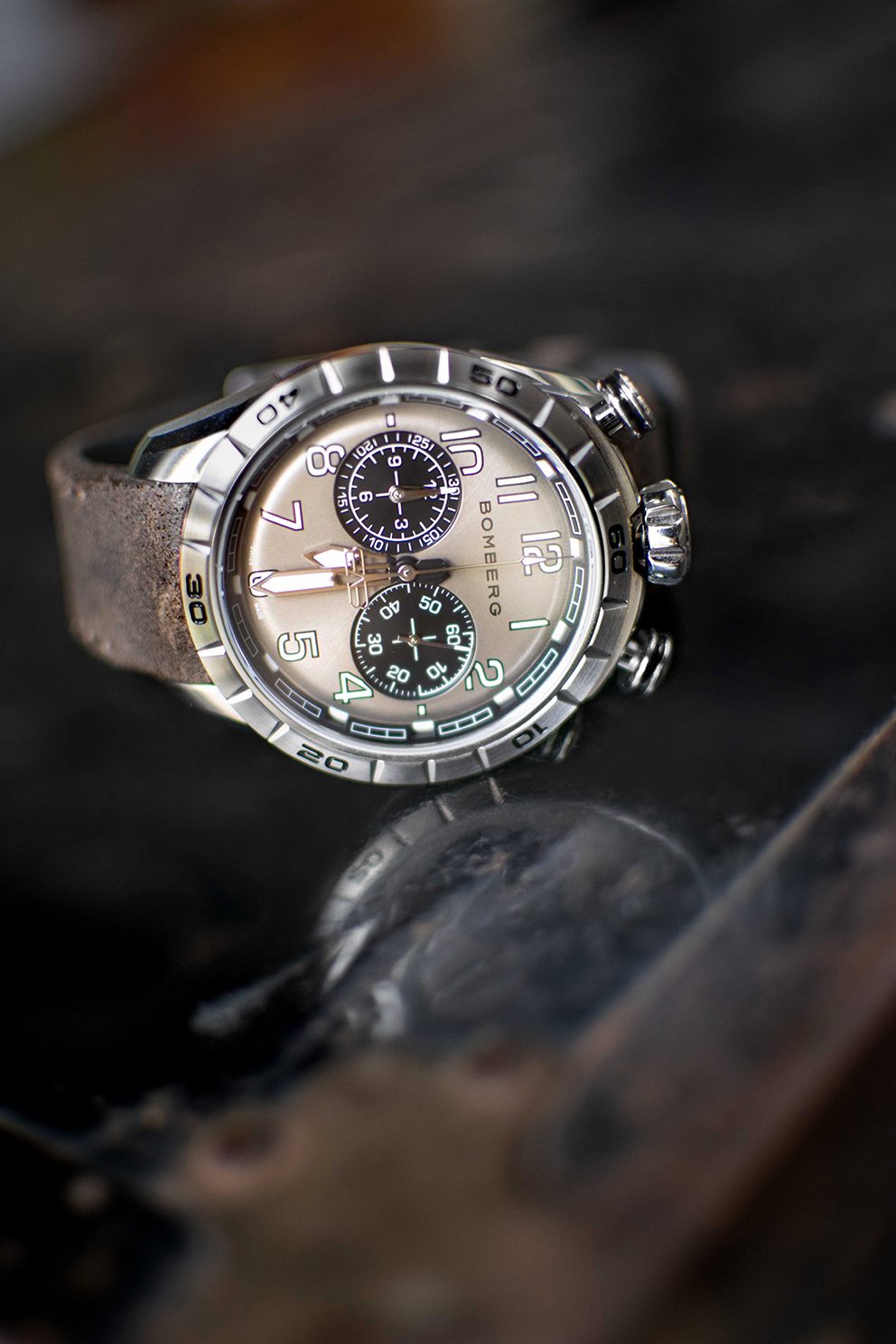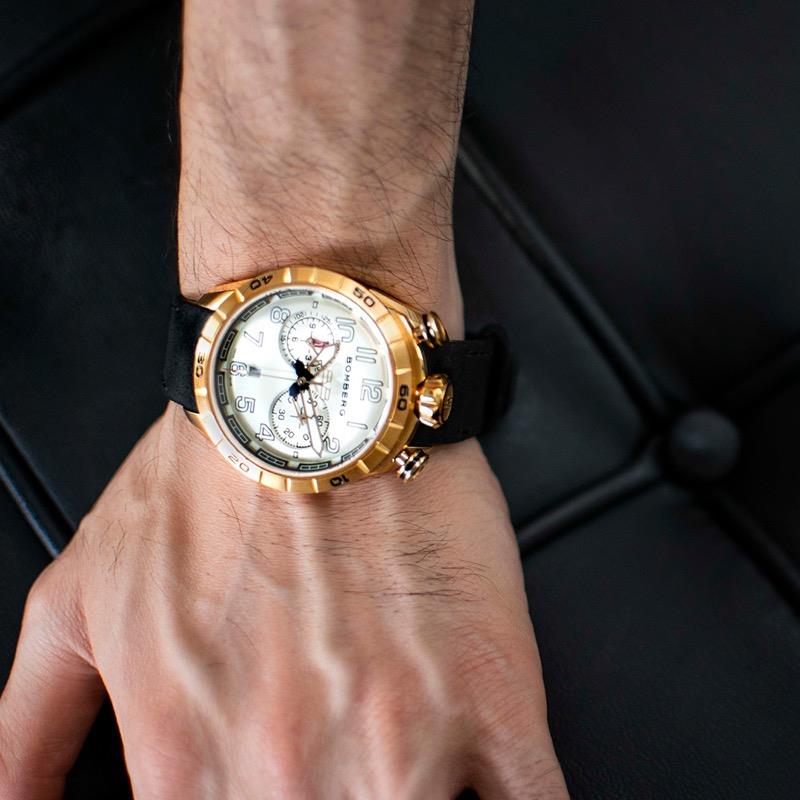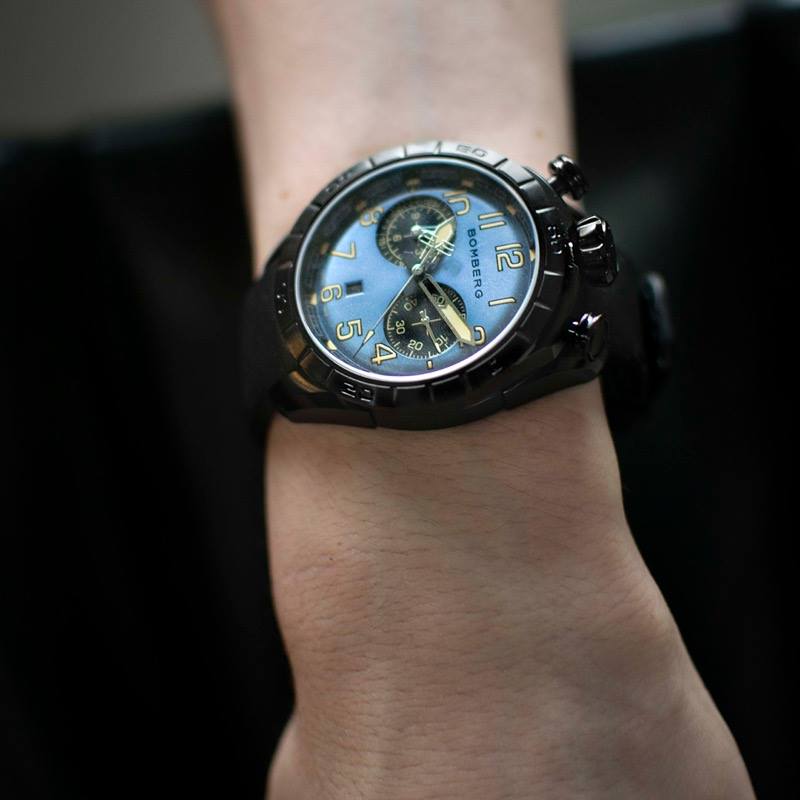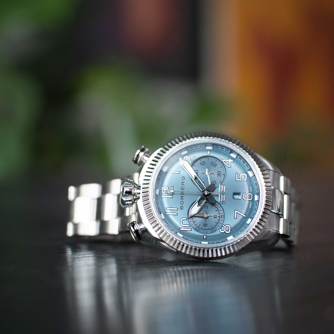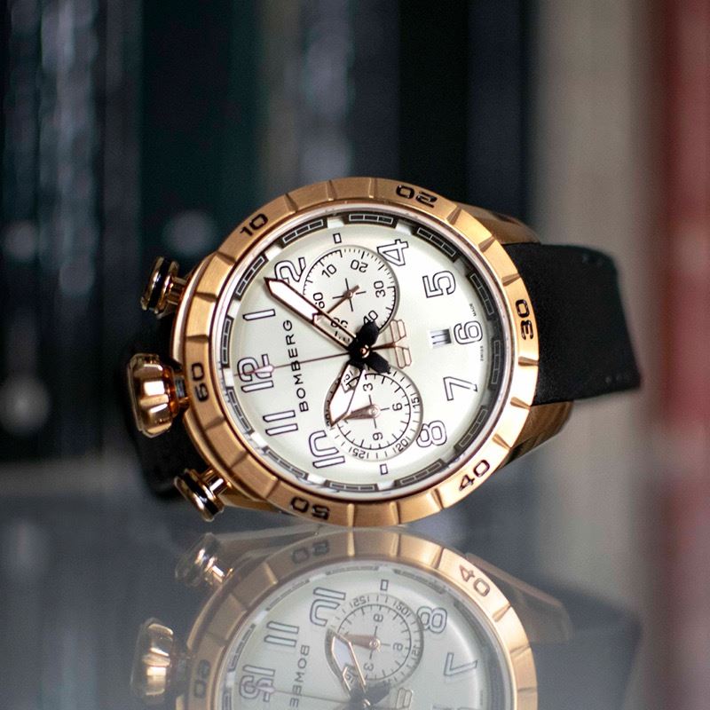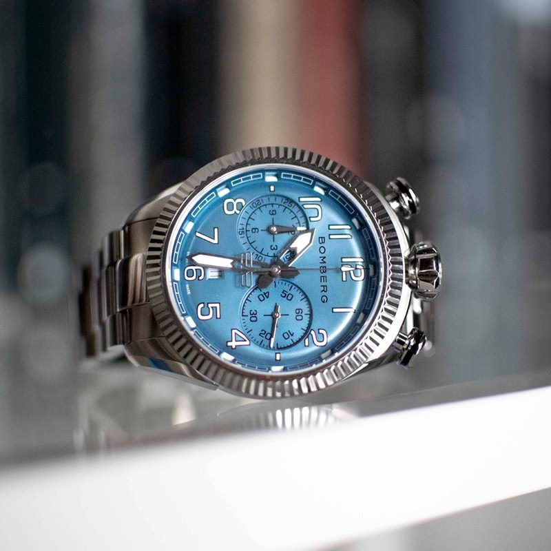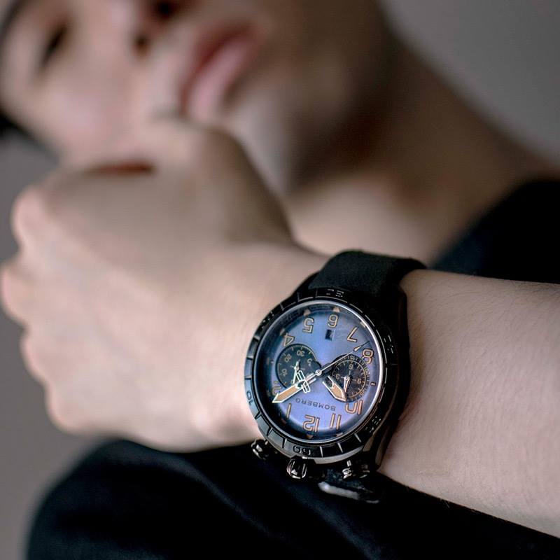 Este cronógrafo muestra la firma de Bomberg conocida como bullhead por la disposición de la corona a las 12 h en punto, con los pulsadores en ambos lados. Con la típica estética Bomberg viril, imponente y poco convencional, concede una comodidad absoluta en la muñeca. Su peculiaridad radica en su carátula ligeramente redondeada que parece un mundo en miniatura que se muestra con gran detalle bajo el cristal de zafiro.