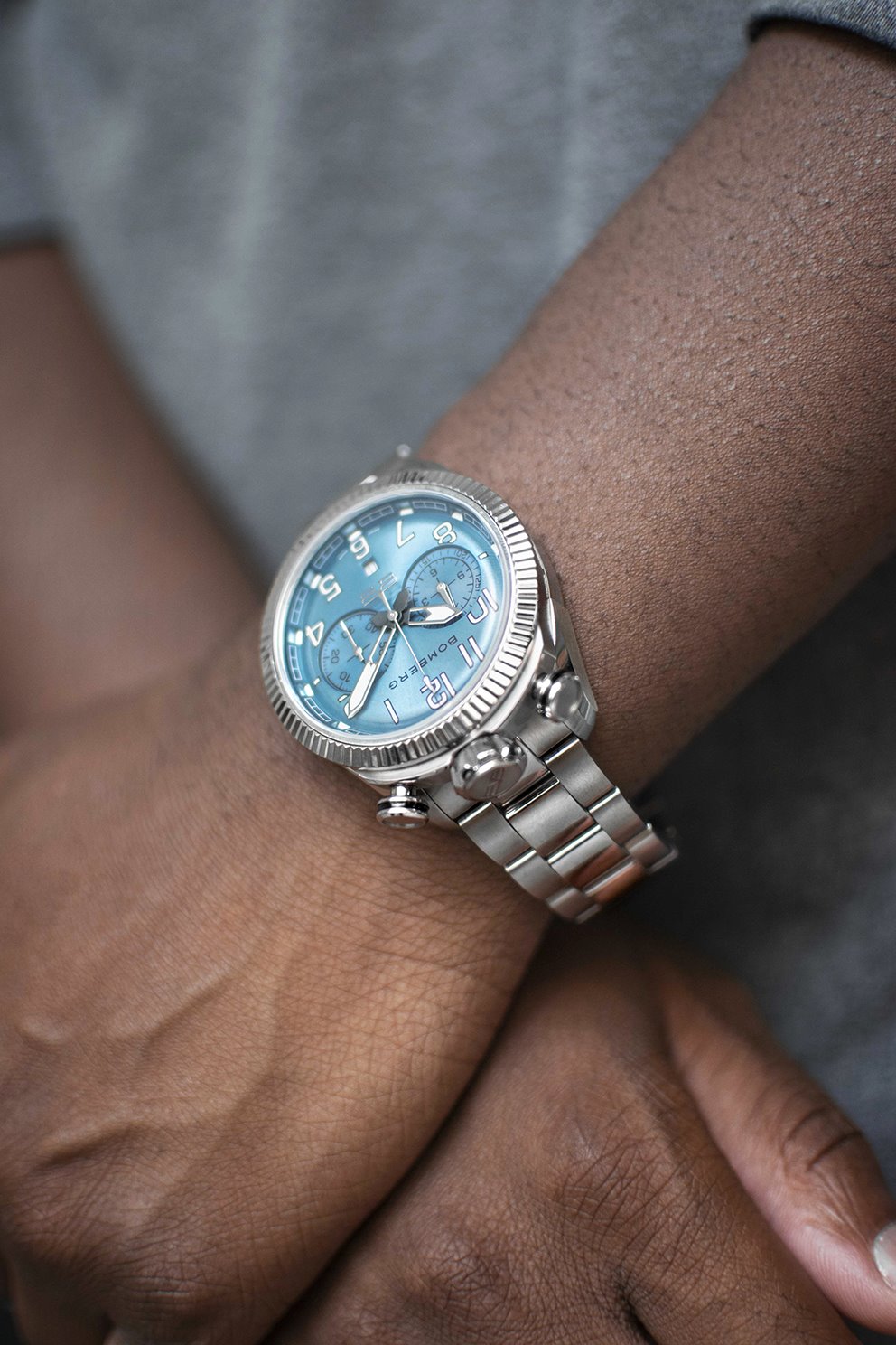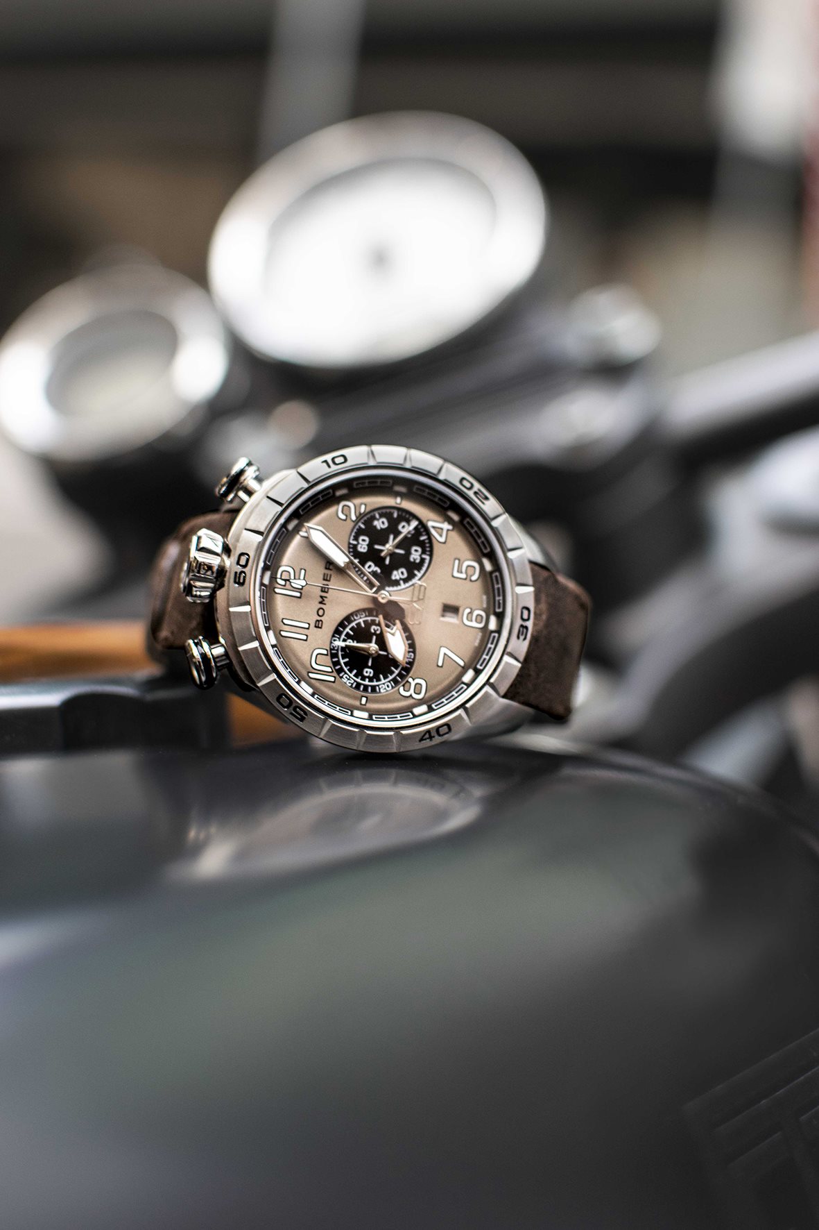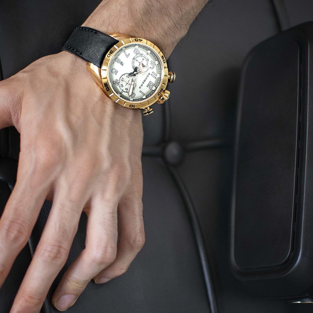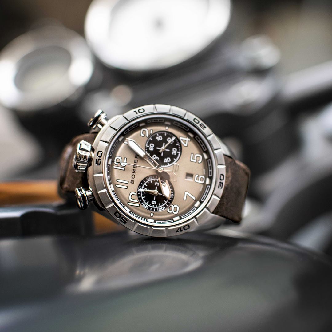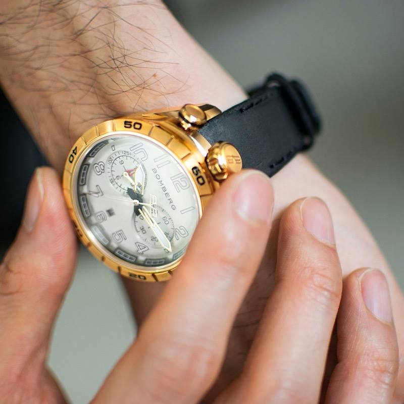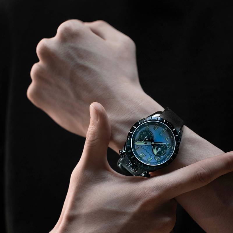 Este cronógrafo muestra la firma de Bomberg conocida como bullhead por la disposición de la corona a las 12 h en punto, con los pulsadores en ambos lados. Con la típica estética Bomberg viril, imponente y poco convencional, concede una comodidad absoluta en la muñeca. Su peculiaridad radica en su carátula ligeramente redondeada que parece un mundo en miniatura que se muestra con gran detalle bajo el cristal de zafiro.