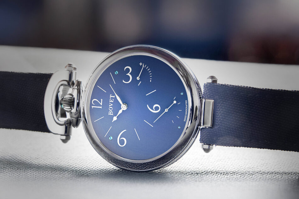 El fondo del reloj exhibe el movimiento, decorado con la misma meticulosidad que sus piezas más complicadas. En el refinamiento estético de los acabados destacan el côtes de Genève, los ángulos pulidos a mano y los grabados delicados. Más del 95% de los componentes se fabrican internamente en las instalaciones de Tramelan de la firma, y todos los relojes se vuelven a probar y se ensamblan finalmente en el castillo Bovet en Môtiers.