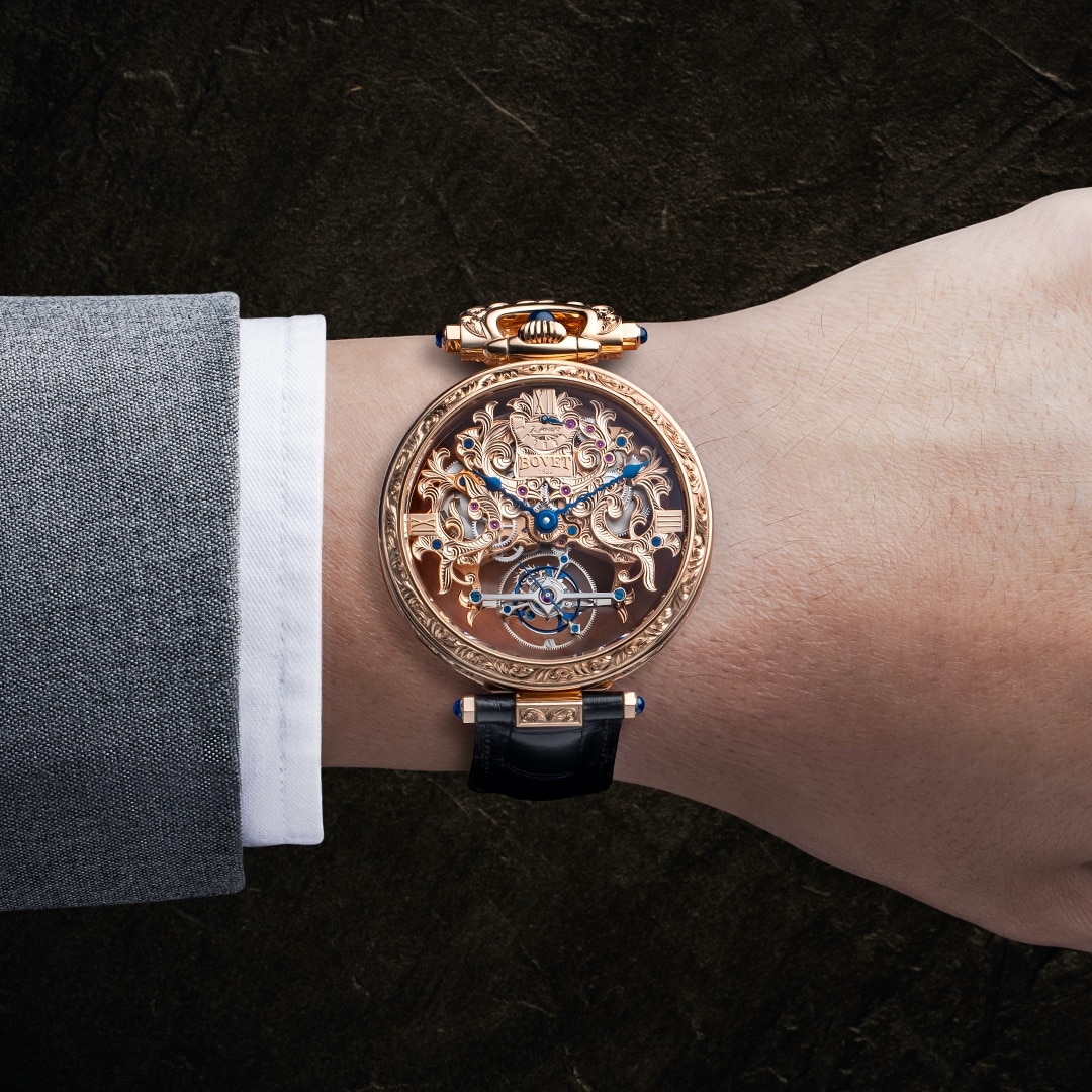 En la caja de 45 mm en oro, la pieza presenta arquitectura esqueletada. Esto permite al usuario admirar de forma ininterrumpida el talento relojero de la marca. Adicionalmente, gracias al sistema patentado “Amadéo”, la pieza se puede utilizar de cuatro maneras distintas: como reloj de pulso, de mesa, de cadena y de bolsillo. Una obra de arte por cualquier lado que se mire, es una pieza única que explota los talentos de la Maison en relojería y artesanía.