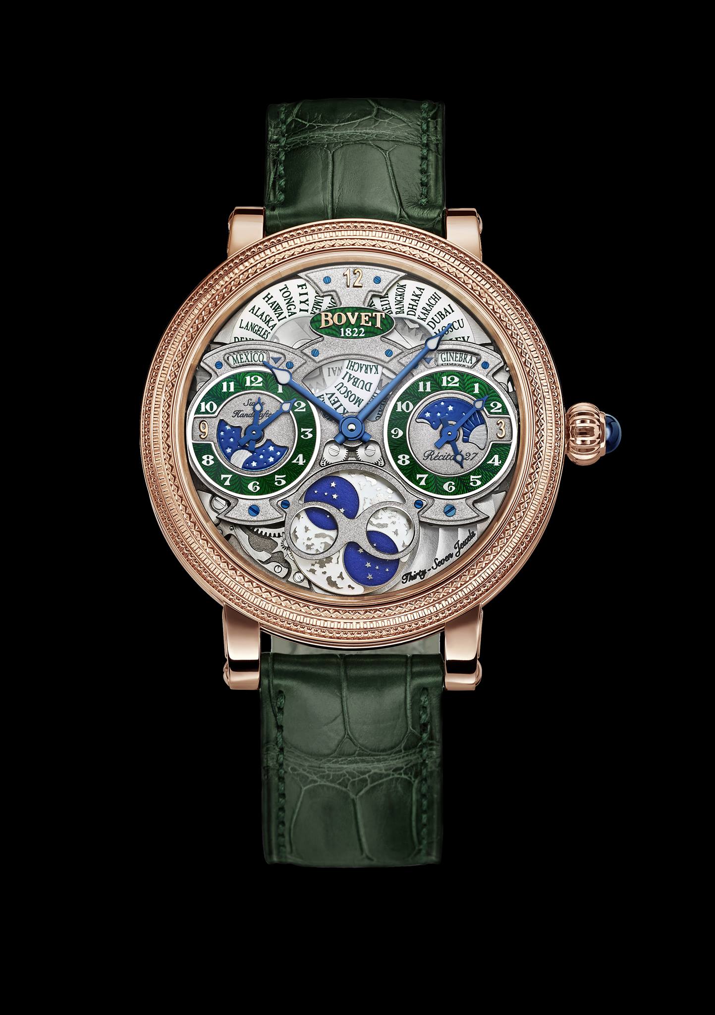 Edición Limitada a 4 piezas, la caja se extiende hasta los 46.3 mm de diámetro y está desarrollada en oro rojo de 18 quilates. Se abraza con correa de aligátor color verde con hebilla de ardillón a juego. Es hermética a 30 metros. El calibre, de manufactura, ofrece 7 días de autonomía a una marcha de 3 Hz.