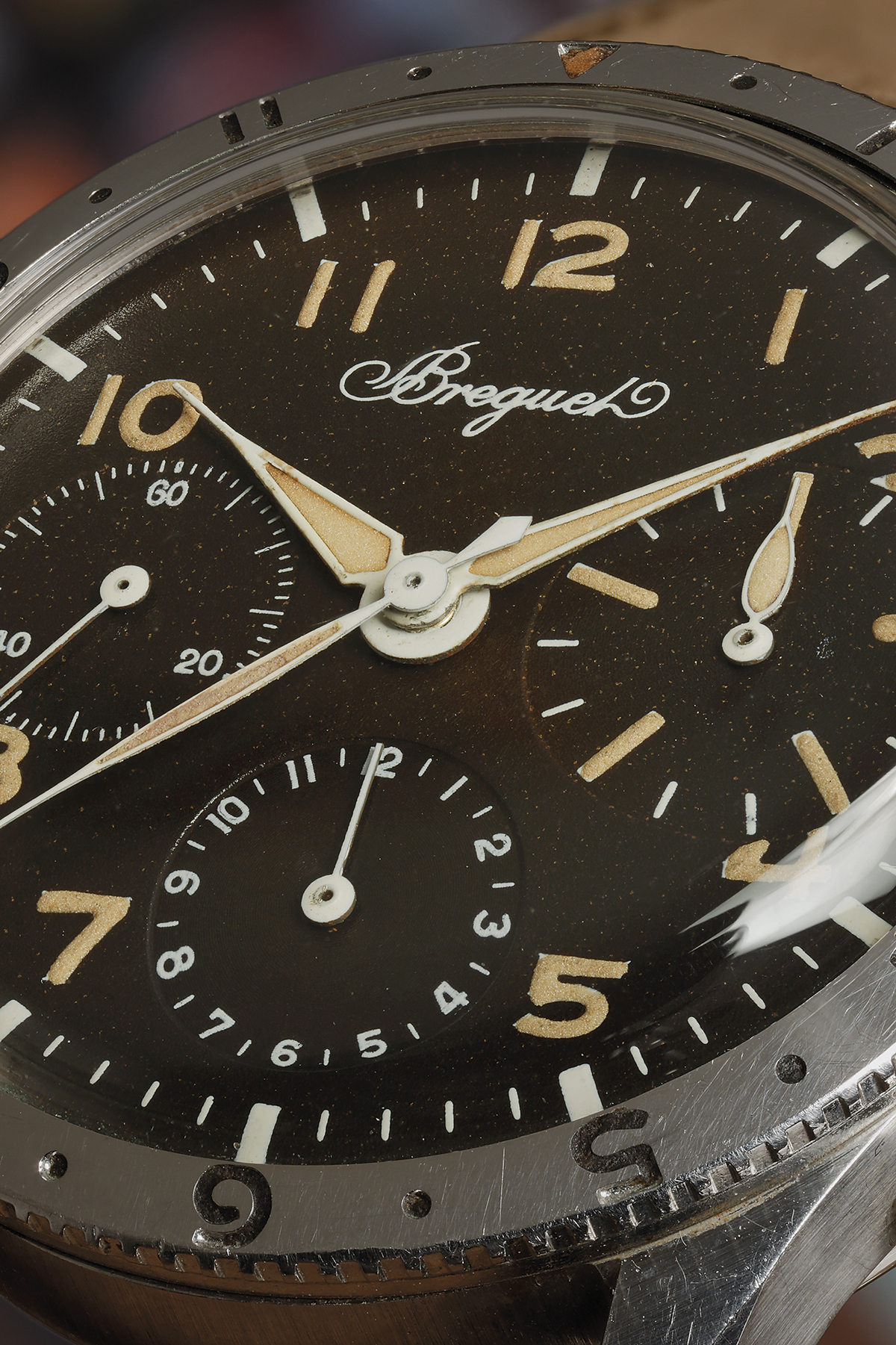 El cronógrafo Type XX adquirido por Breguet pertenece a la primera generación de estos relojes. Está distinguido por una caja de acero inoxidable cepillado con extensión de 38,5 mm. La carátula luce un color marrón oscuro con agujas luminiscentes y números arábigos.