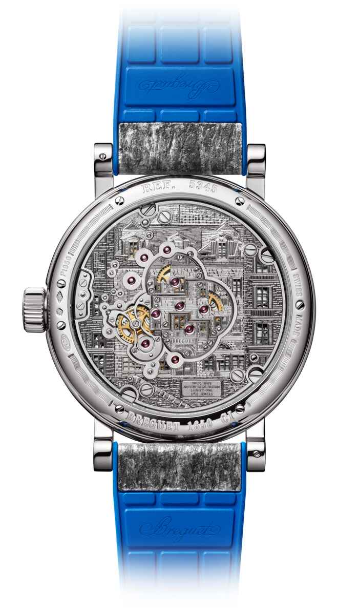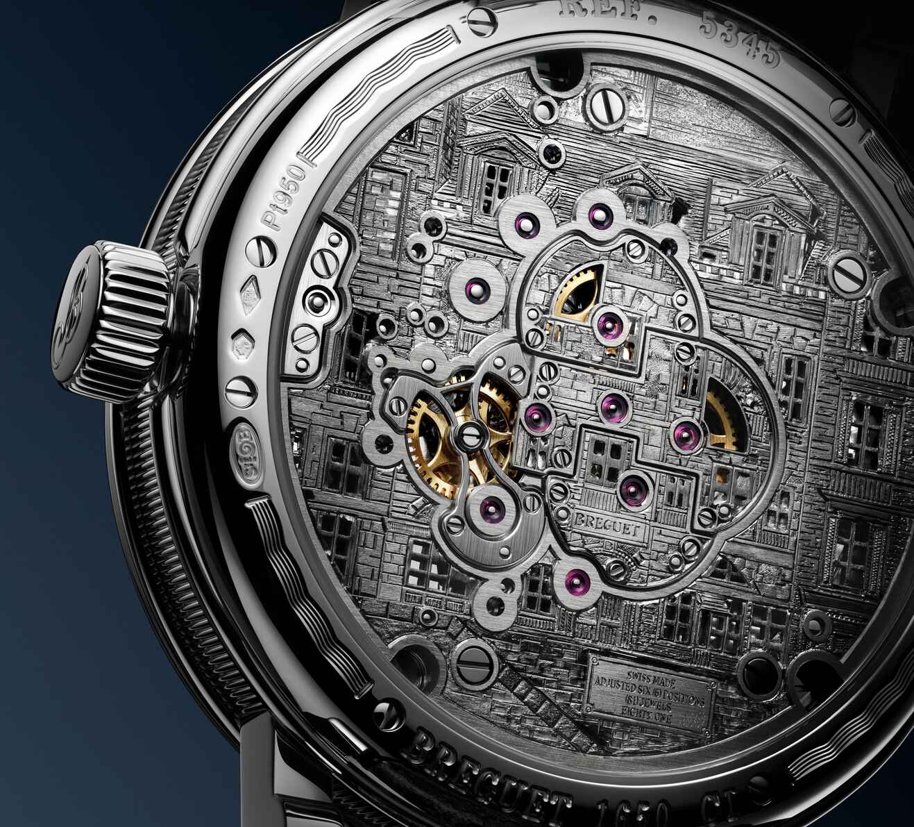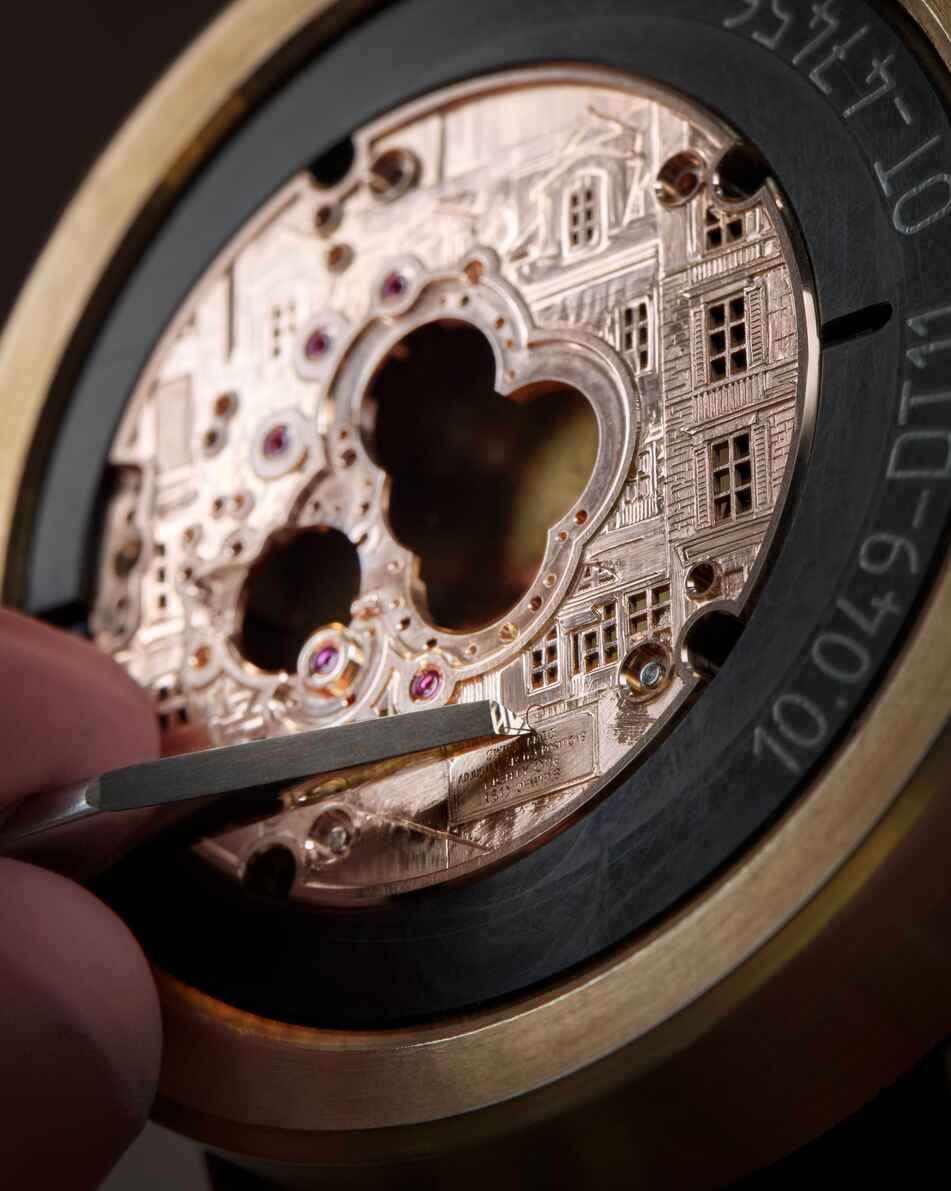 Sin embargo el fondo es aún más impresionante que el lado frontal de la pieza, pue está acabado a mano por los artesanos de la Maison y lleno de magníficos detalles. Un grabado representa la fachada del edificio que el Maestro ocupó a partir de 1775 en el 39 del Quai de l’Horloge de París. La obra, realizada en oro, es tan meticulosa que los cristales de las ventanas permiten entrever los rodajes del calibre, como si de una ventana entre dos mundos de excelencia se tratara.