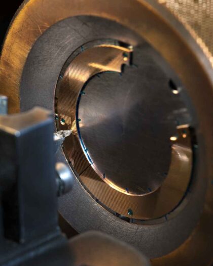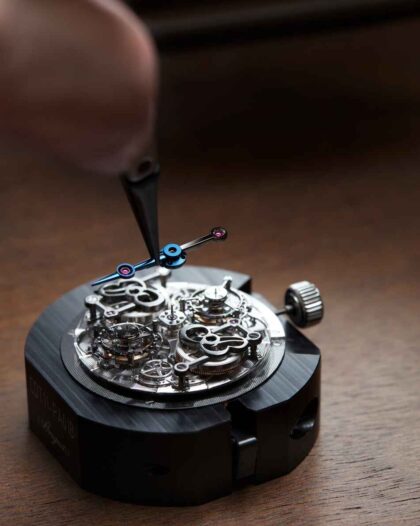 El Double Tourbillon se libera ahora de la carátula para revelar toda la belleza de su complicada mecánica. Todos los componentes están meticulosamente achaflanados e incluso satinados a mano. El guilloché, firma de la Manufactura, también encuentra un nuevo campo de expresión en el movimiento, reemplazando el tradicional perlado. Así expuesto, el calibre revela el flanco interno de la carrura, sobre el cual destaca, grabada a mano, la sombra de los números romanos de la circunferencia de las horas en zafiro.