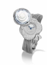 Caja de oro blanco de 18 quilates. Motivo floral en camafeo grabado a mano y motivo nudo de oro blanco 18 quilates engastado con 432 diamantes talla brillante fijados sobre un eje giratorio que revela la hora. Realce engastado con 48 diamantes talla brillante.