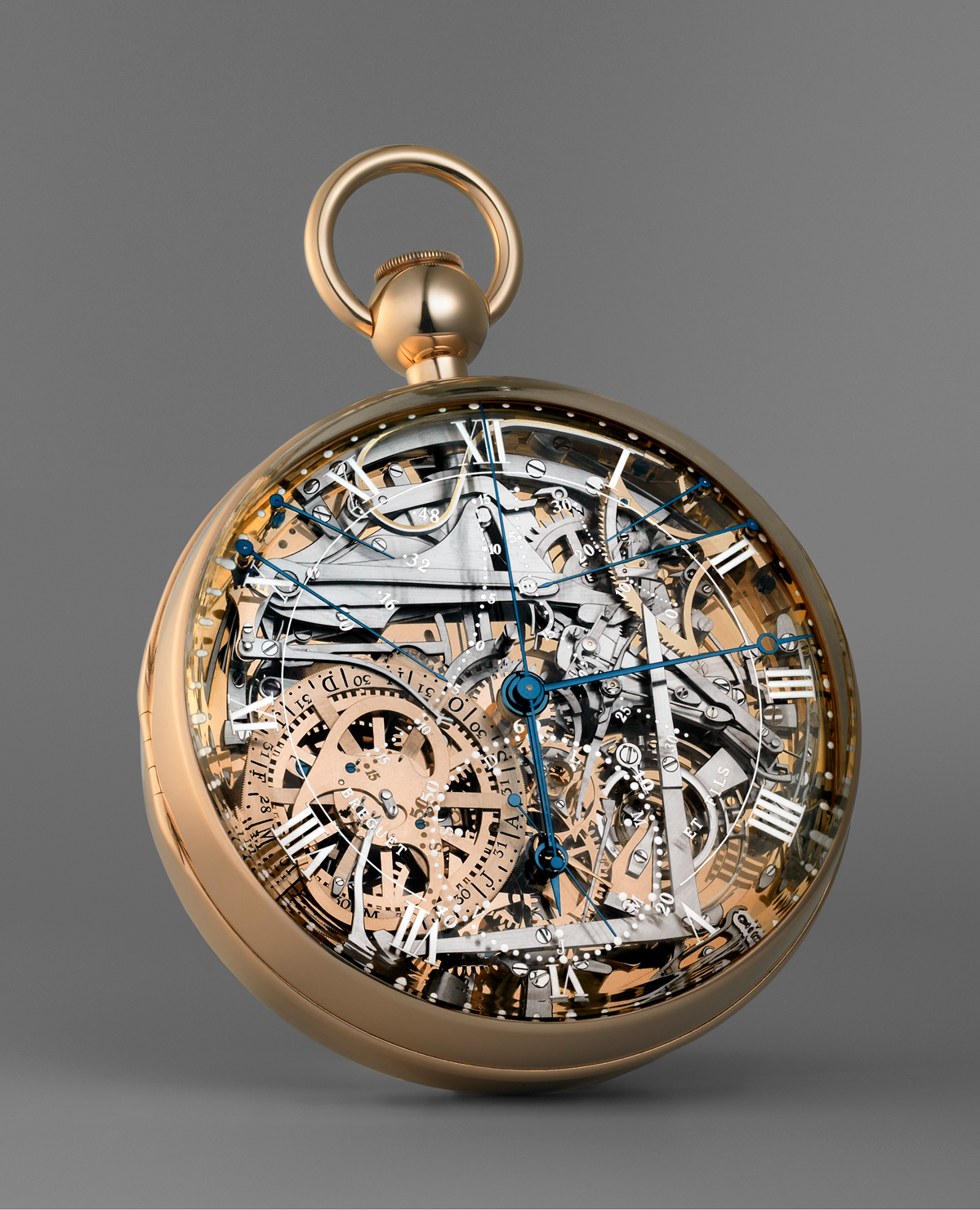 Construido en caja –de 64 mm– de 18 quilates de oro de aleación especial, cristales hechos de cristal mineral, como en su época. Además ya incorpora el mecanismo de corona, que sirve para corregir las horas y detonar el repetidor de cuartos y minutos. Asimismo exhibe las horas y minutos al centro, un segundero pequeño a las 6 h, la ecuación del tiempo en punto de las 10 y un calendario perpetuo. Termímetro a la 1:30 horas. Está animado por el mecanismo de remonte automático denominado perpétuelle, y está formado por 823 componentes para una reserva de marcha de 48 horas a 2.5 Hz.