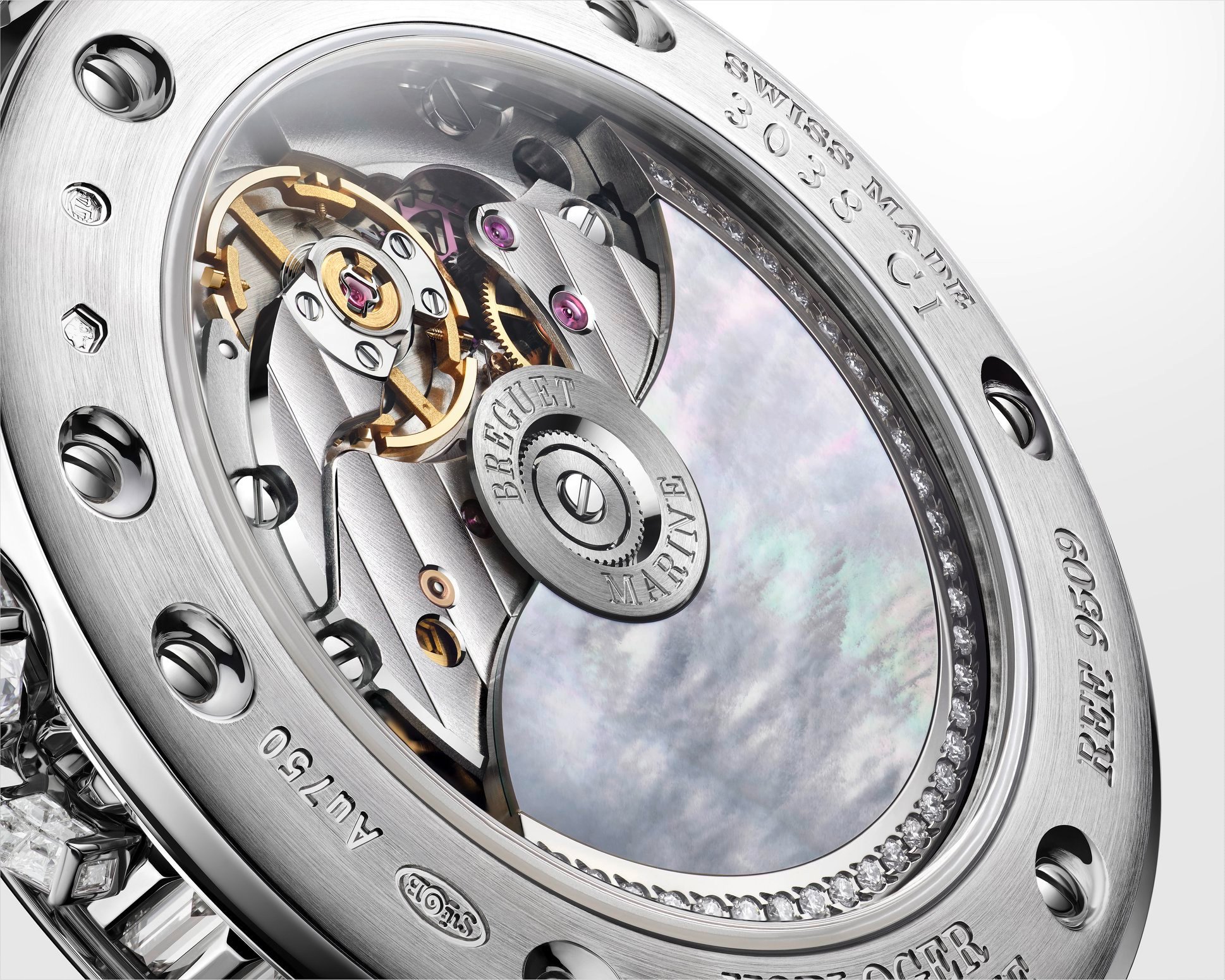 Al interior se presenta el calibre 591C de remonte automático y perfil ultraplano. Posee un acabado de puentes guilloché a mano con motivo Marine, mientras que la masa oscilante de oro blanco posee nácar de Tahití y engaste de diamantes. En el contorno se puede leer la inscripción “Relojero de la Marina Real Francesa”, título otorgado a Abraham-Louis Breguet en 1815.