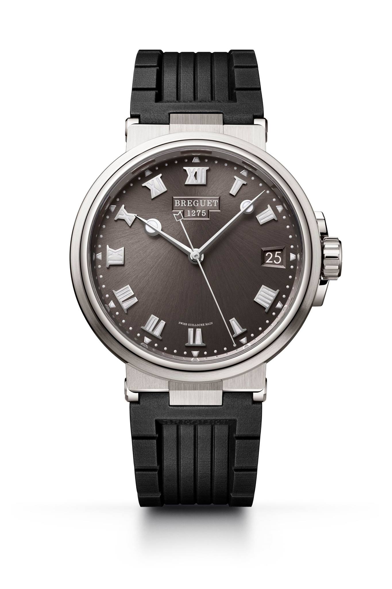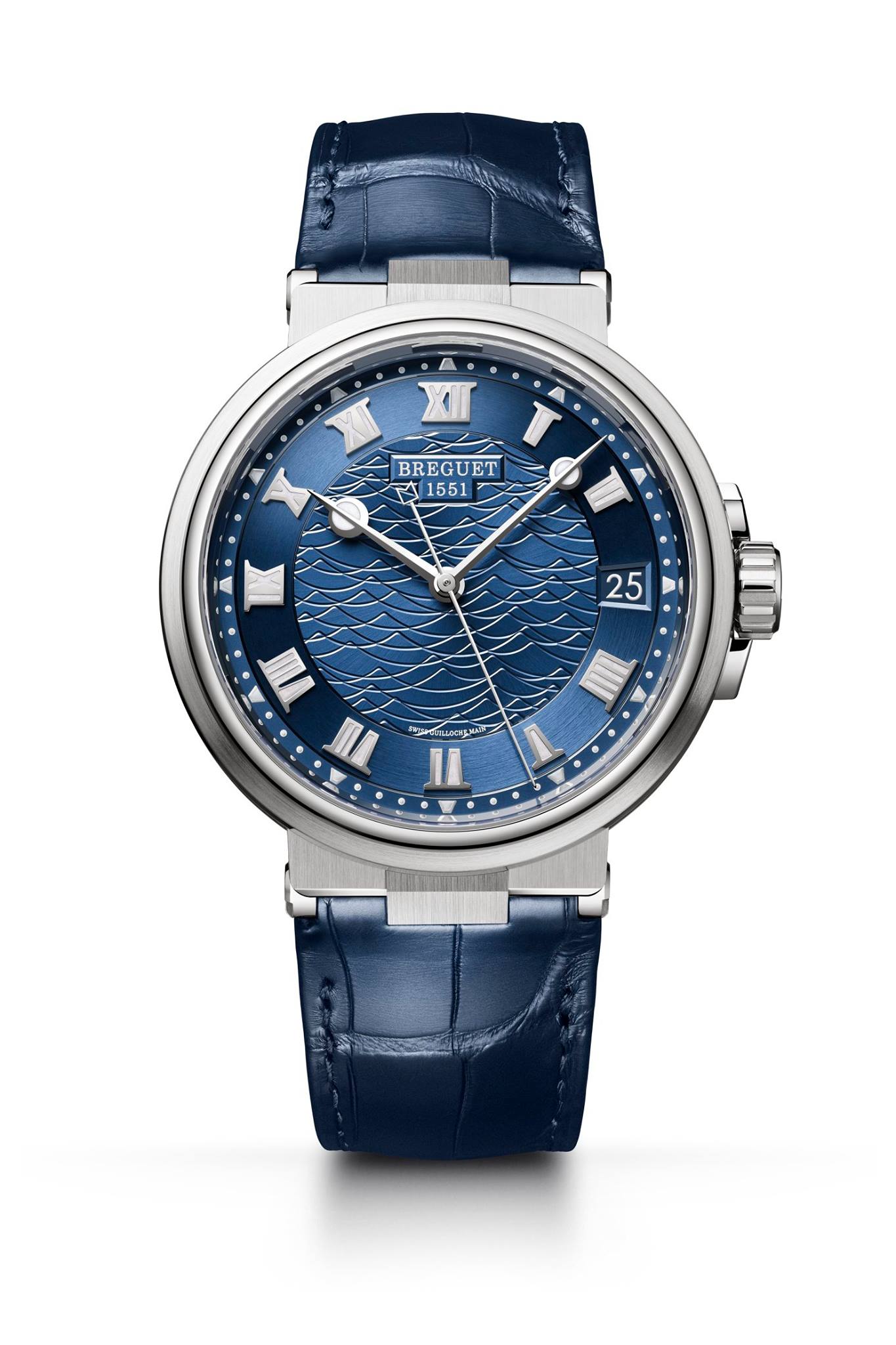 Para caracterizar a esta nueva generación, el Marine 5517 muestra la fecha a las 3 h. en un disco horario de números romanos recubiertos con un material luminiscente, al igual que los índices de los minutos y las agujas Breguet. La aguja del segundero alude al universo marino y va decorada con una «B» que emula una señal marítima.