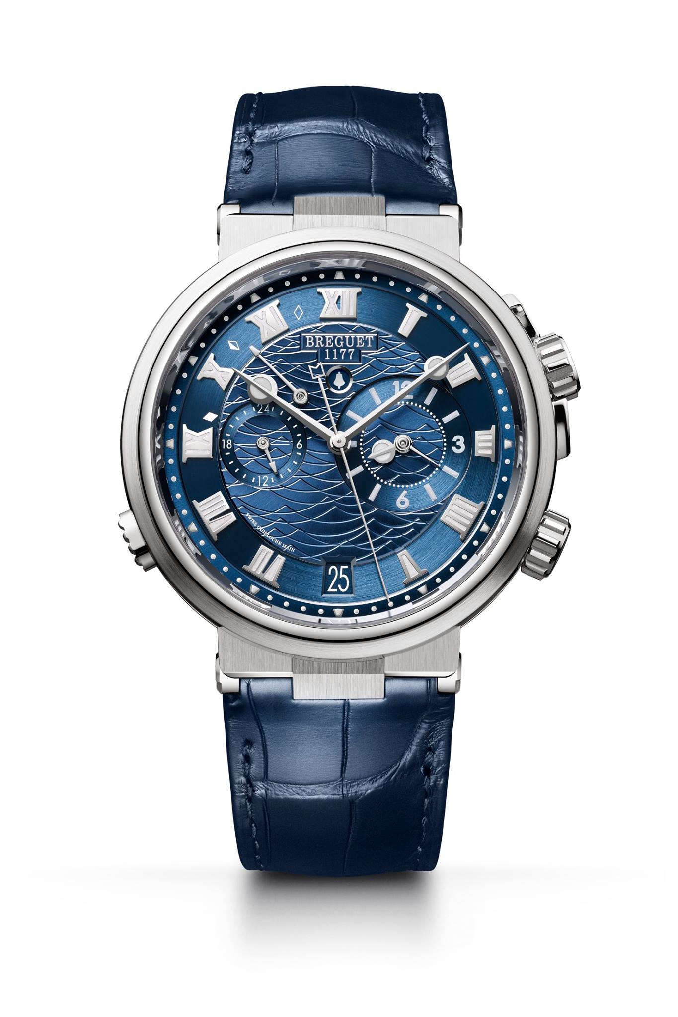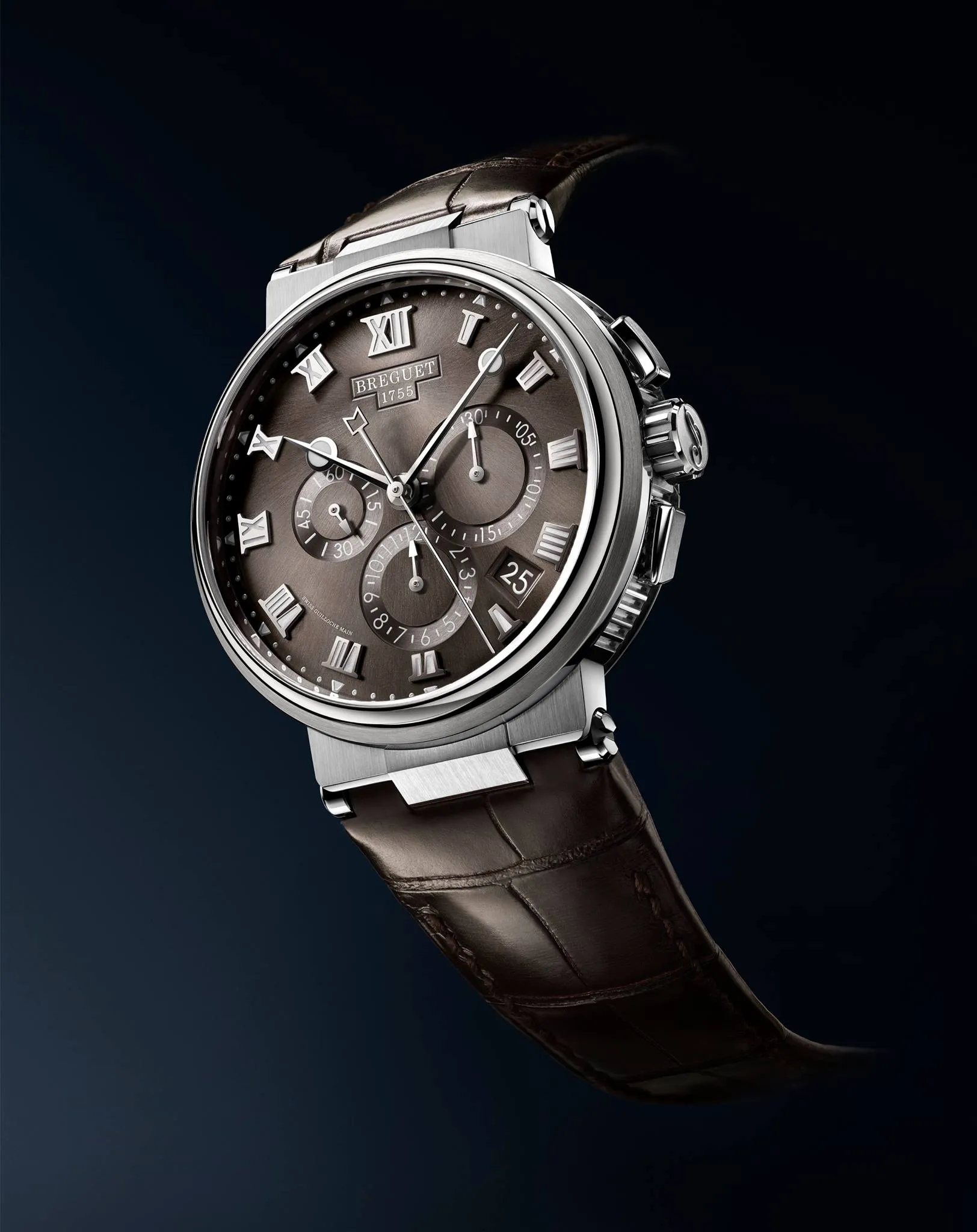 Abraham-Louis Breguet fue el precursor de innumerables inventos del mundo de la relojería como el tourbillon o el paracaídas, por citar algunos, así como el cronógrafo con rattrapante, una complicación que muy pronto cumplirá ya dos siglos de existencia. Por si fuera poca hazaña el hecho de haber creado antes de 1810 un reloj con doble segundero que pudiera ponerse en marcha y detenerse a demanda, A.-L. Breguet también fabricó un ingenioso cronógrafo de tinta con su alumno Fatton e incluso, en 1820, diseñó el cronómetro de doble segundero o «cronómetro de observación», antecesor indiscutible de todos los cronógrafos con rattrapante. El trabajo de Breguet ha sido una fuente de inspiración para el gremio en todos los ámbitos y, especialmente en el de los cronógrafos. Este reloj de 42,3 mm marca tendencia con todos los códigos gráficos de la nueva generación de modelos Marine que fue presentada el año pasado. La aguja del cronógrafo, ubicada en el centro, se reconoce perfectamente por su sutil detalle marino. Las diferentes indicaciones temporales se visualizan mediante dos ventanillas: los minutos a las 3 h. y las horas a las 6 h. En la esfera descentrada a las 9 h. se encuentra el pequeño segundero. La indicación de la fecha, situada entre las 4 y las 5 h., completa esta creación de aspecto deportivo.