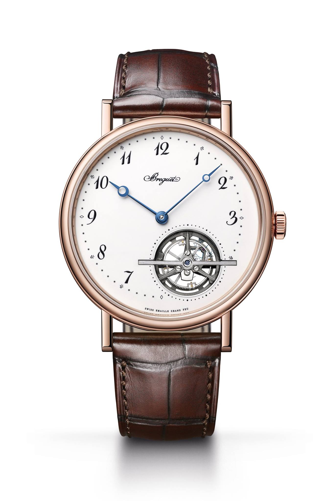 El nuevo Classique Tourbillon Extra-Plat Automatique 5367 con dial de esmalte Grand Feu está disponible en oro rosa o en platino, con correa de piel de aligátor color caoba o azul, respectivamente, y movimiento rodiado en ambos modelos.
