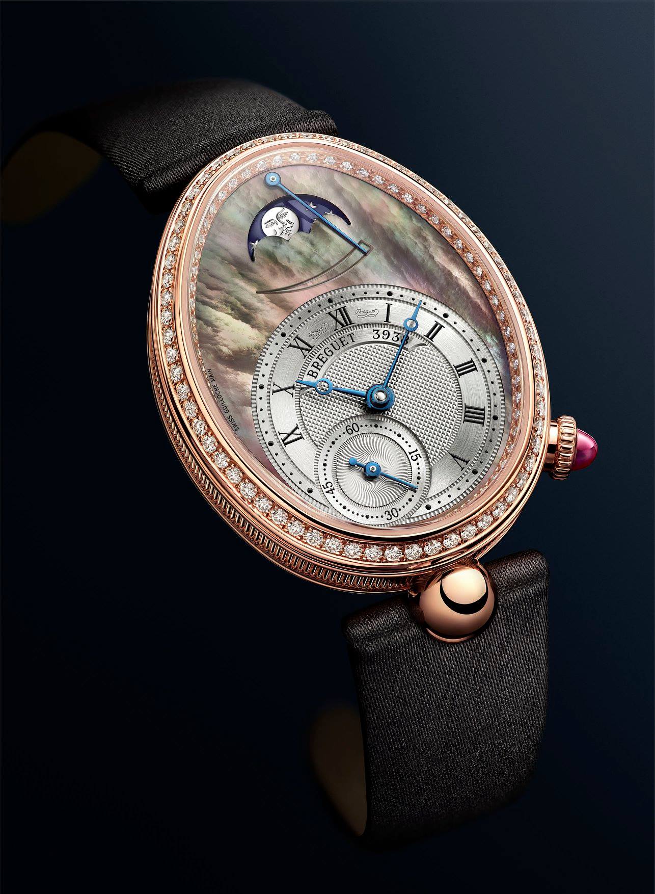 Este año, Breguet presenta una variante del modelo Reine de Naples 8908, el primer reloj de la línea epónima lanzada en 2002. Esta novedad se caracteriza por la combinación de una caja de oro rosa engastada con 128 diamantes, con una esfera parcialmente hecha de nácar de Tahití. Reaviva los principales atributos del modelo original, a saber, las fases de la luna y el indicador de reserva de marcha situados a las 12 h., así como el disco horario y el pequeño segundero descentrados a las 6 h. y a las 7 h. respectivamente. La distribución de estas funciones se inspira en el primer reloj de pulsera de la historia, que A.-L. Breguet fabricó entre 1810 y 1812 para Caroline Murat, Reina de Nápoles. Según los archivos históricos de la Casa, que se conservan en el museo Breguet (Place Vendôme, París), la pieza nº 2639 era un reloj de repetición ovalado para llevar en la muñeca. Poseía un escape de áncora, conocido como «escape libre» y estaba dotado de un termómetro y de un indicador de avance/retroceso fuera de la esfera –que en la referencia 8908 se han sustituido por la indicación de las fases de la luna y de la reserva de marcha. Cuando se entregó el 21 de diciembre de 1812 presentaba una esfera plateada con decoración guilloché y números árabes.