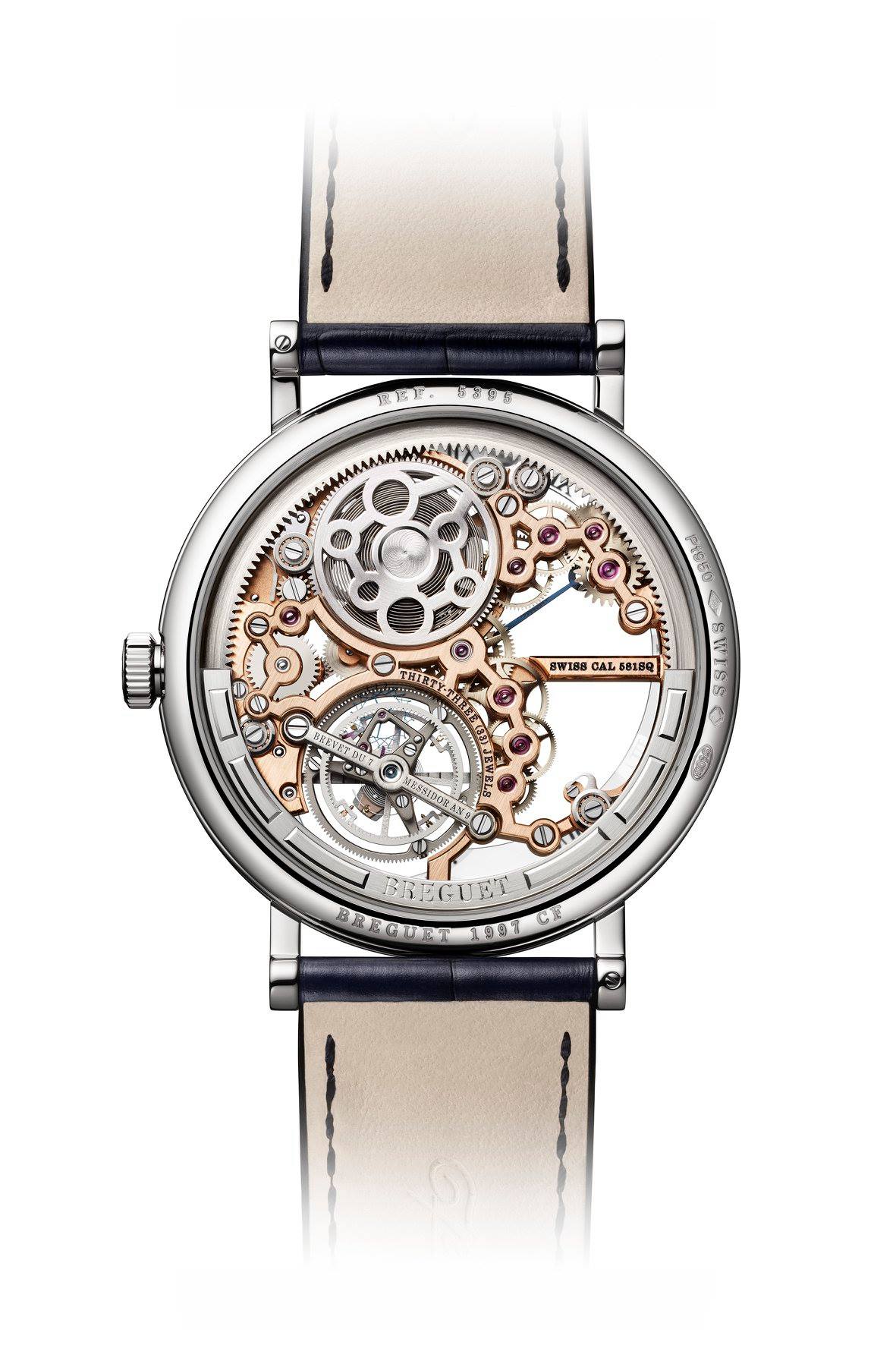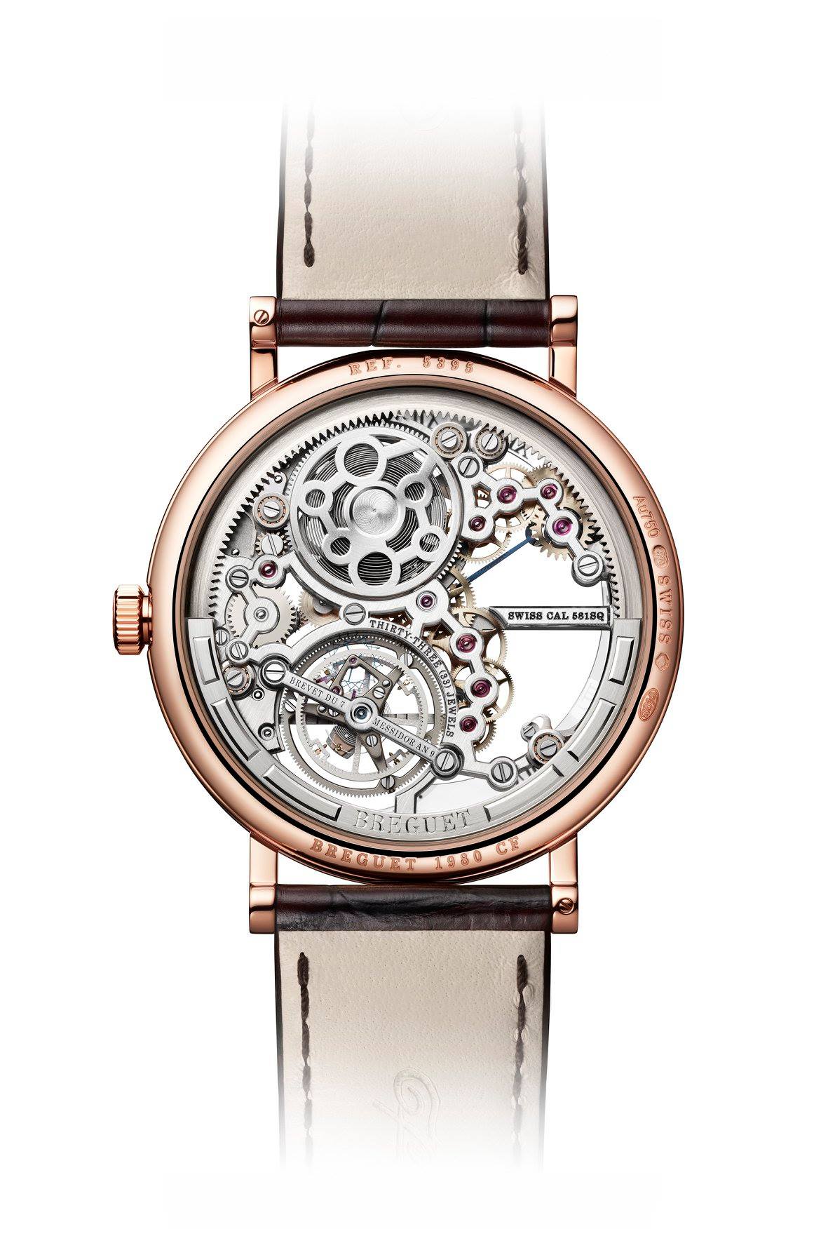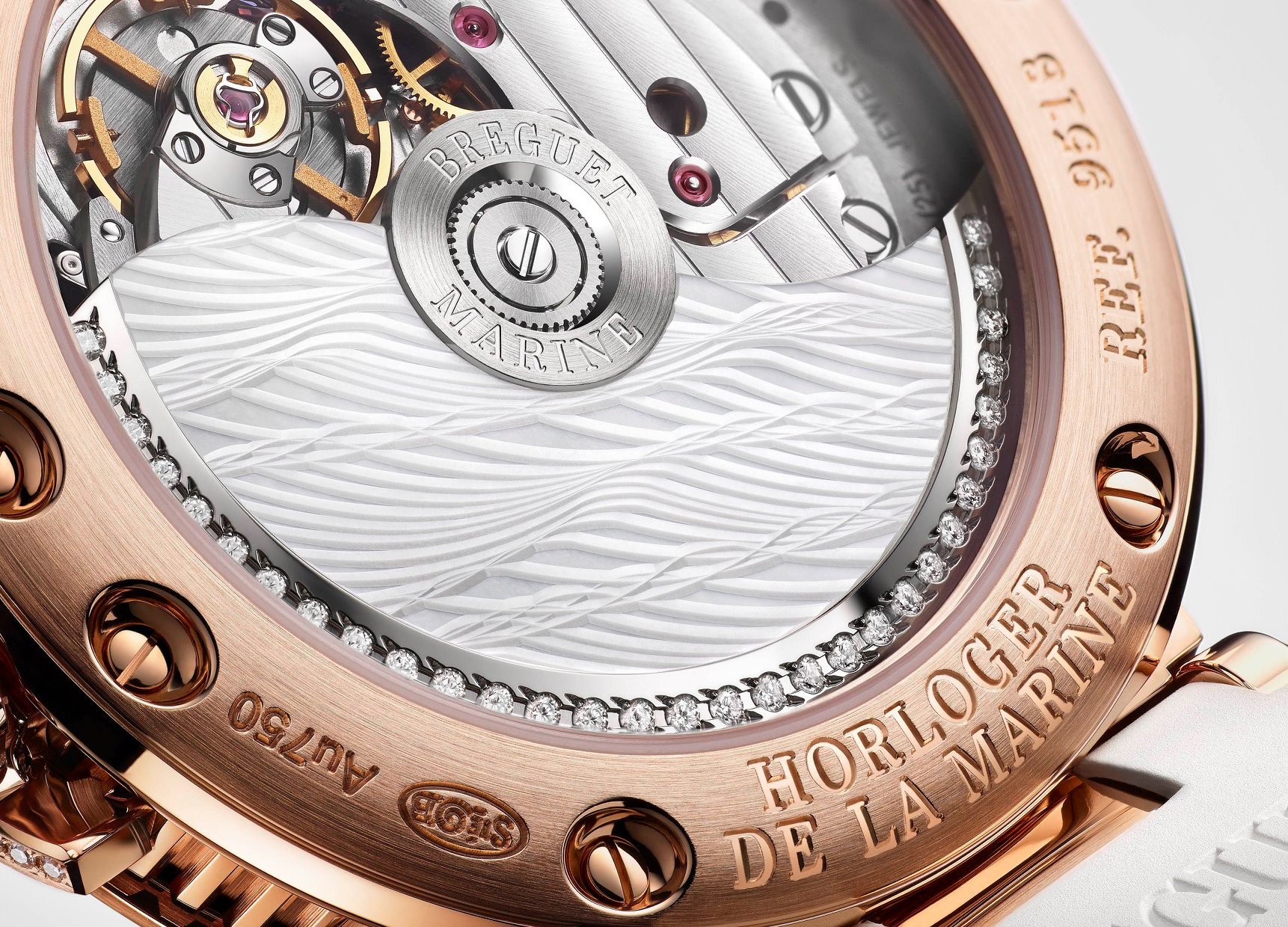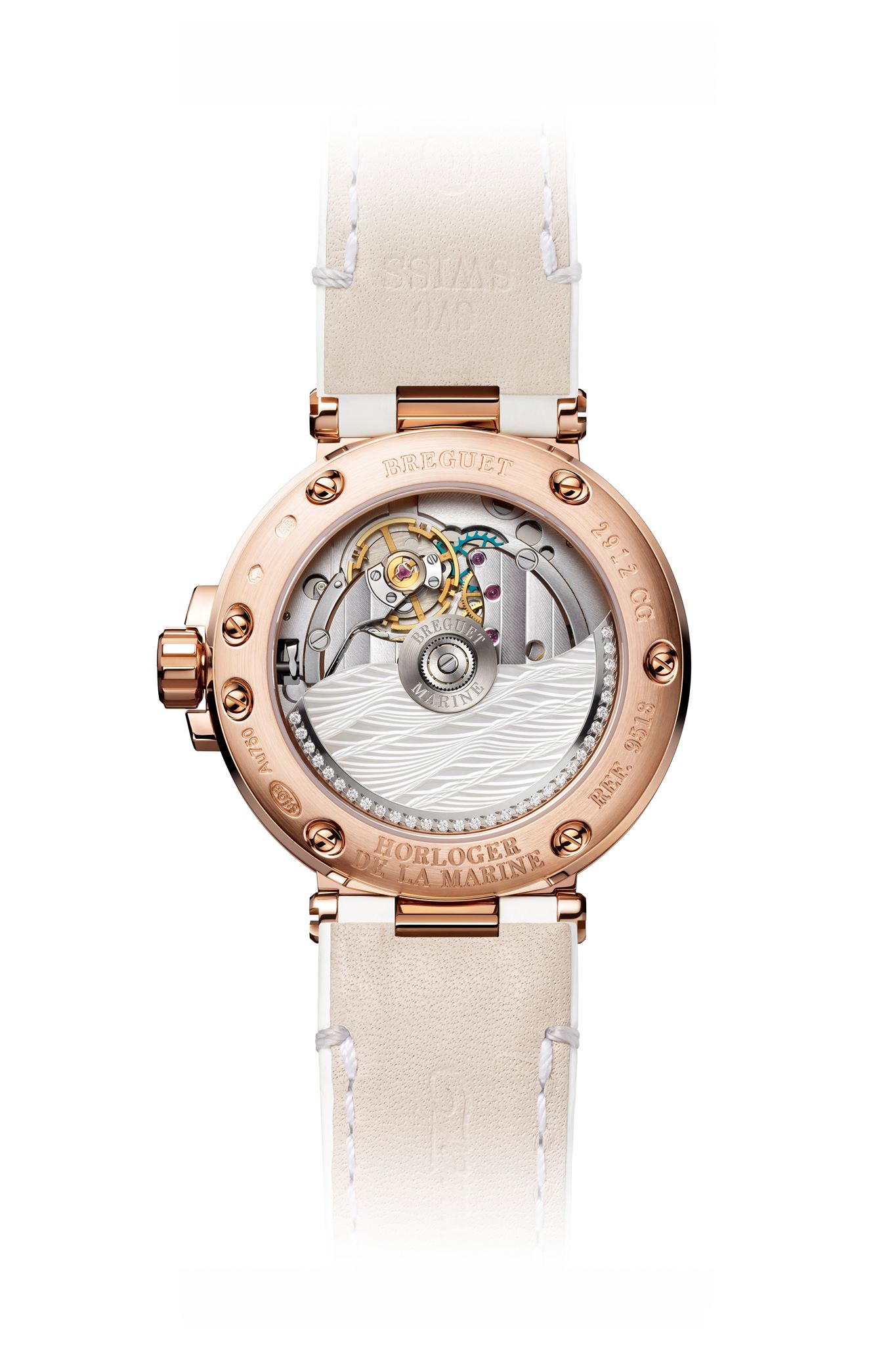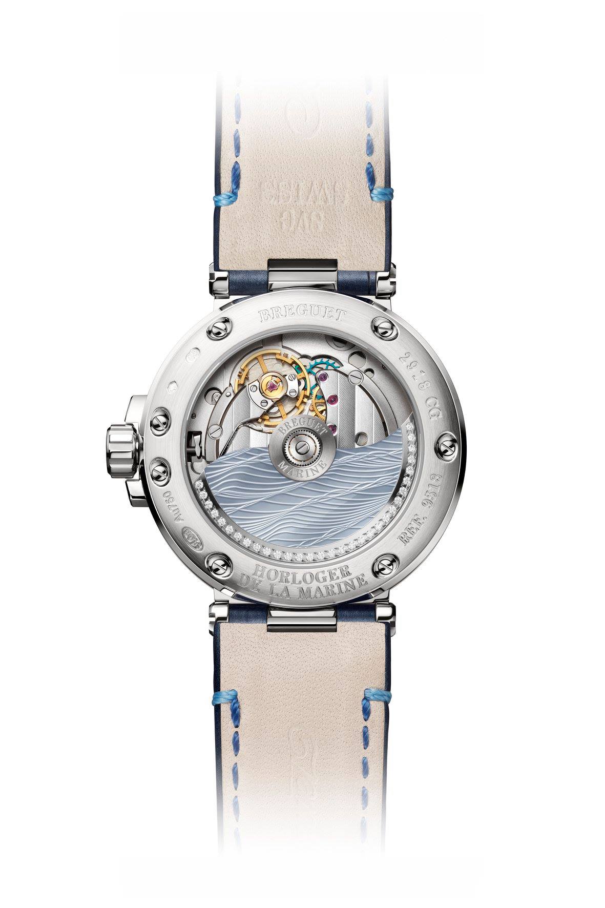 Animado por el calibre 591A, se puede ver el fondo de cristal de zafiro del nuevo modelo. El movimiento se aloja en una fina caja con bordes acanalados, siguiendo también los códigos Breguet. Para una mejor manipulación, la corona, dotada de un cabujón de zafiro azul o de un rubí, también presenta acanaladuras. Las ataduras, soldadas para mayor solidez y torneadas para un mayor confort de uso, sujetan la pulsera de piel.