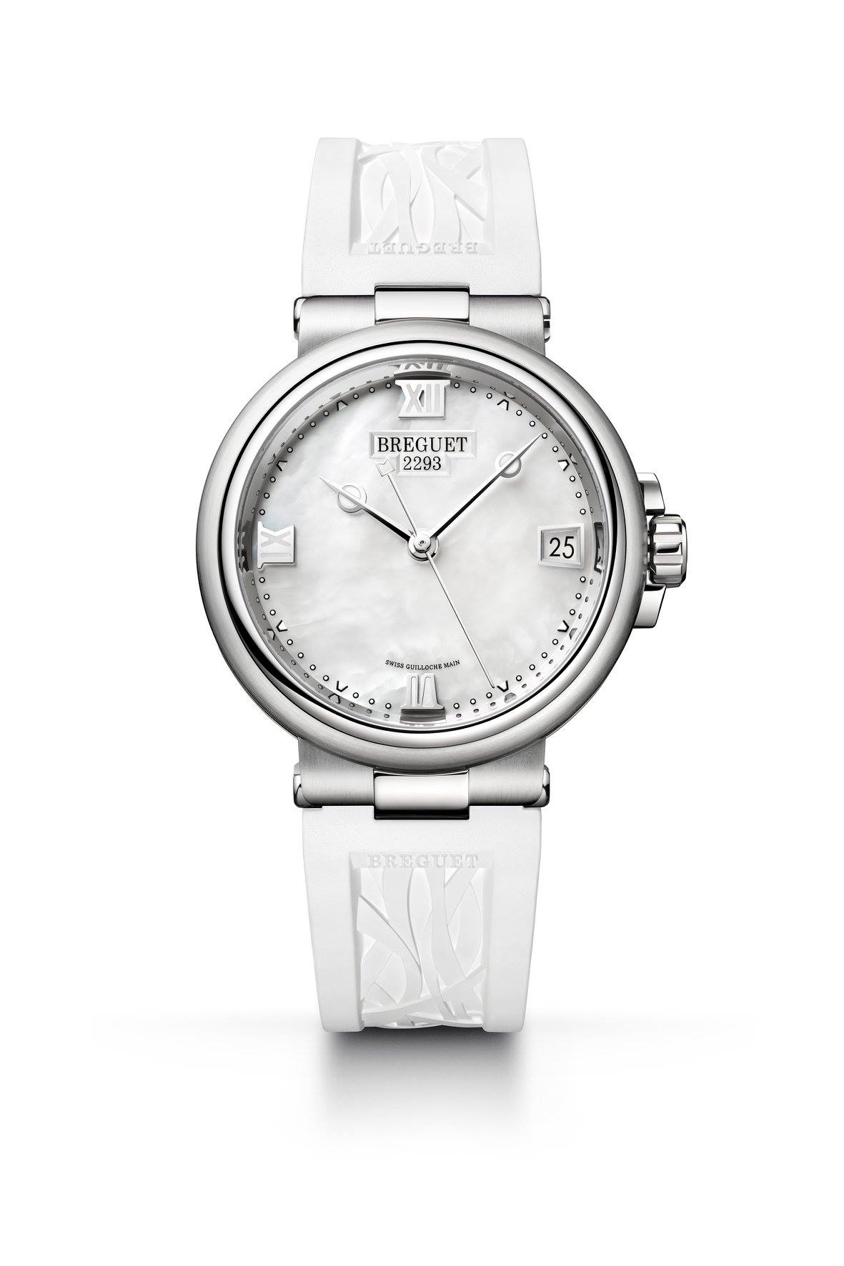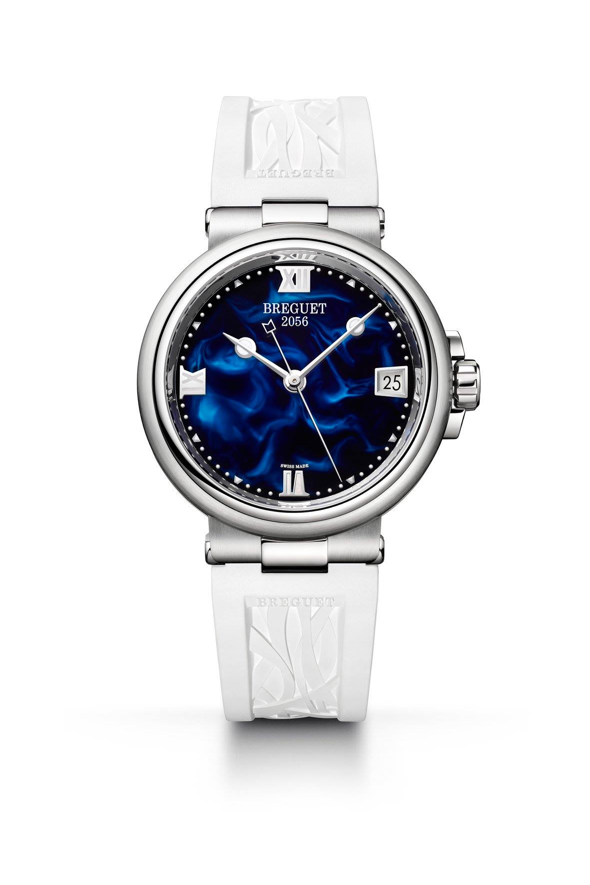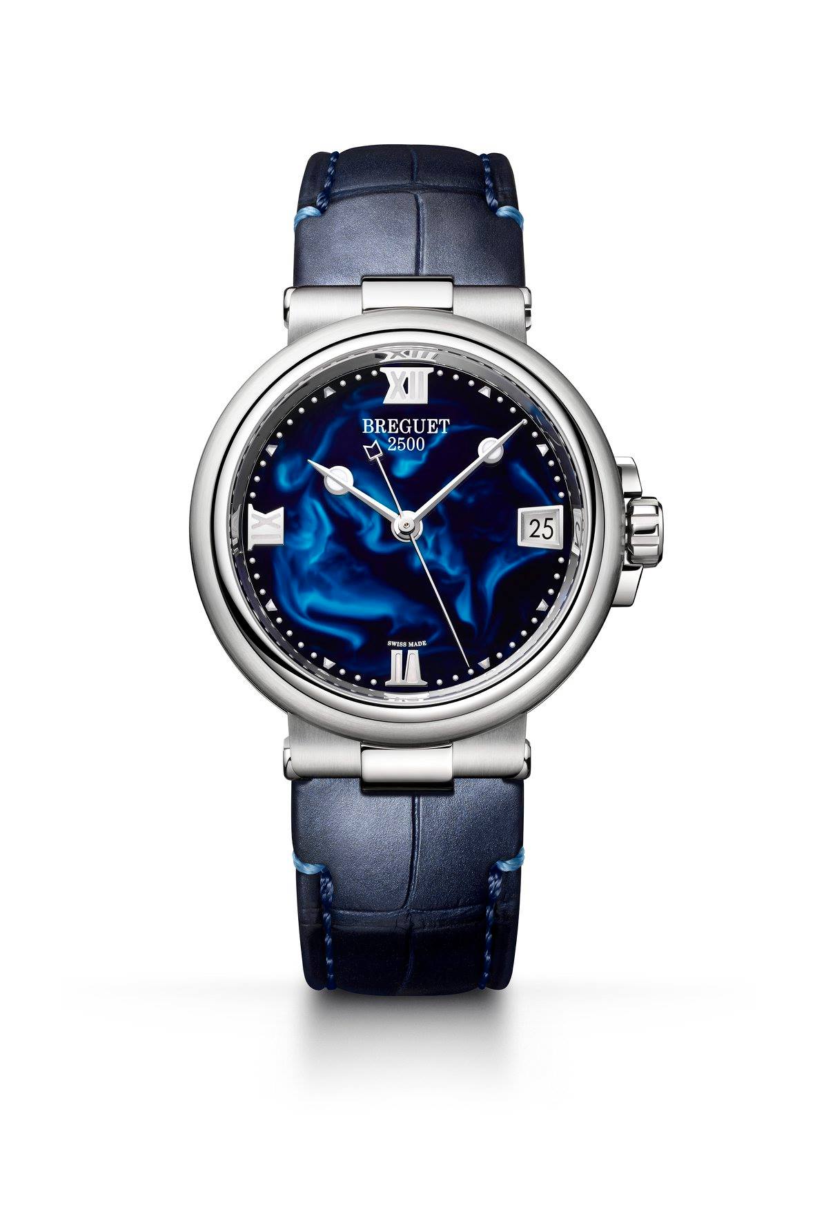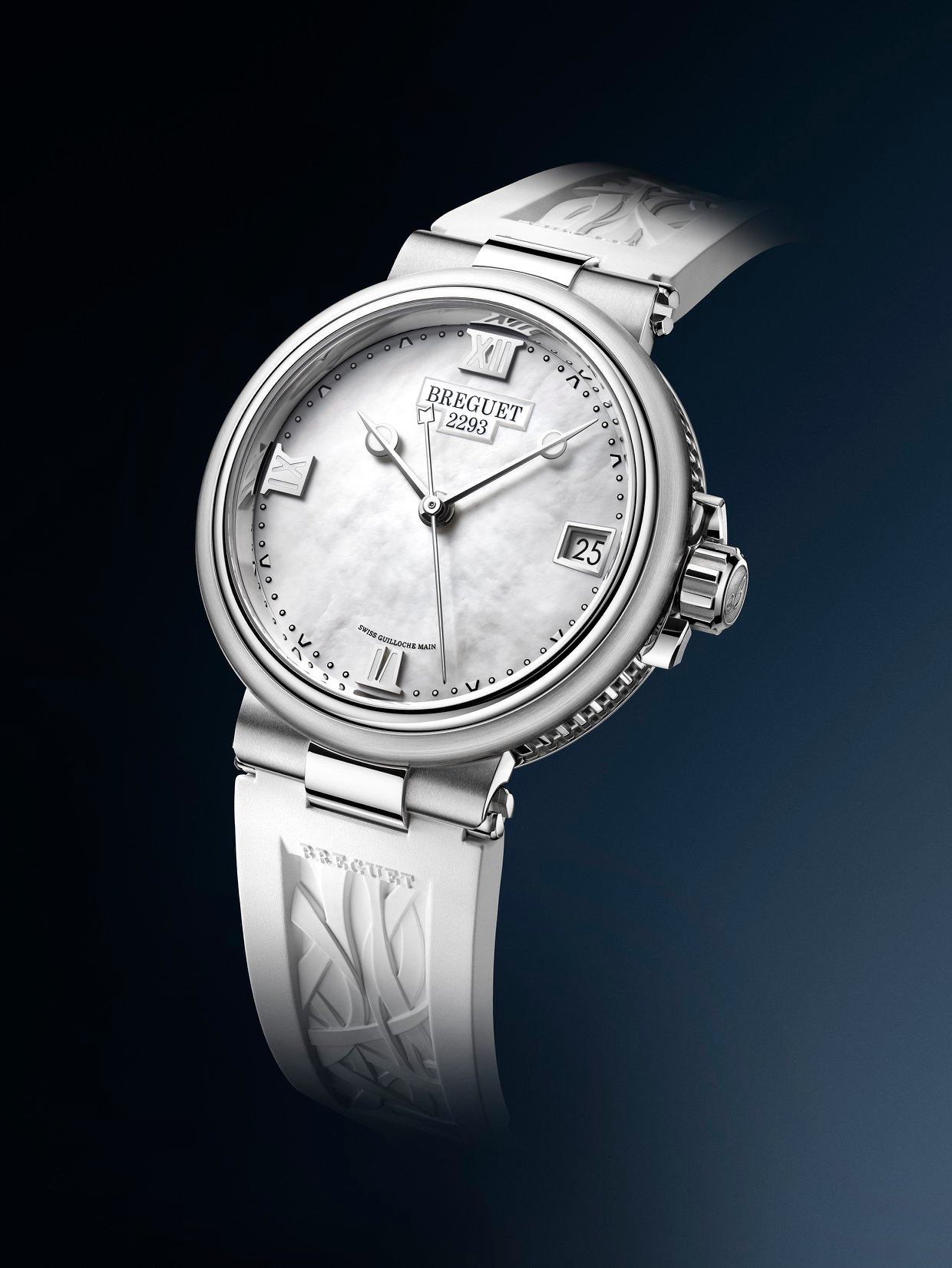 La Maison Breguet propone el Marine en versiones de acero y acero engastado, particularmente adaptadas a un uso deportivo. La carátula de estos modelos se viste de nácar opalino natural o de laca azul jaspeada, y está animada con volutas más claras que evocan las olas espumosas o un cielo estrellado, punto de referencia de los navegantes de antaño.