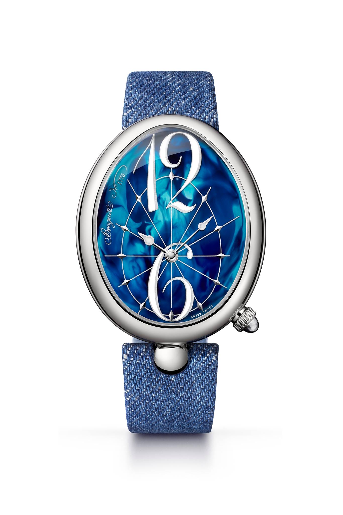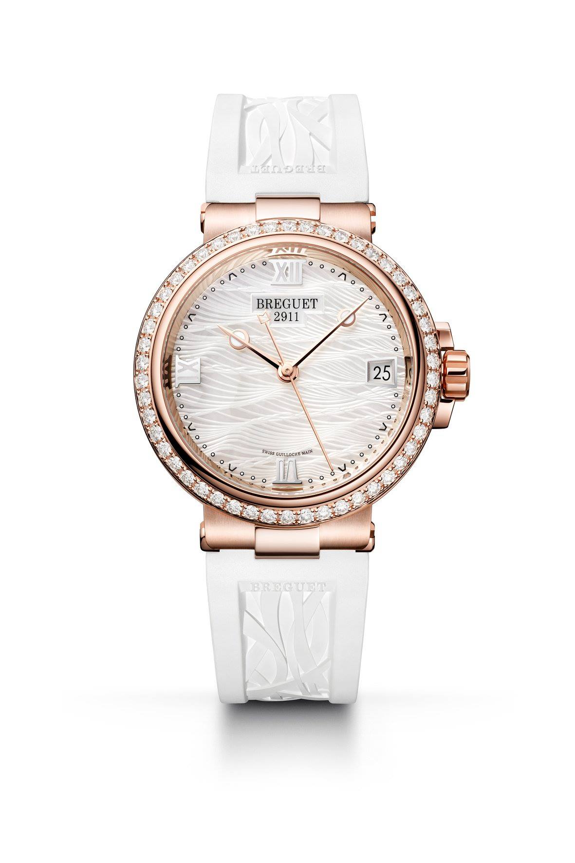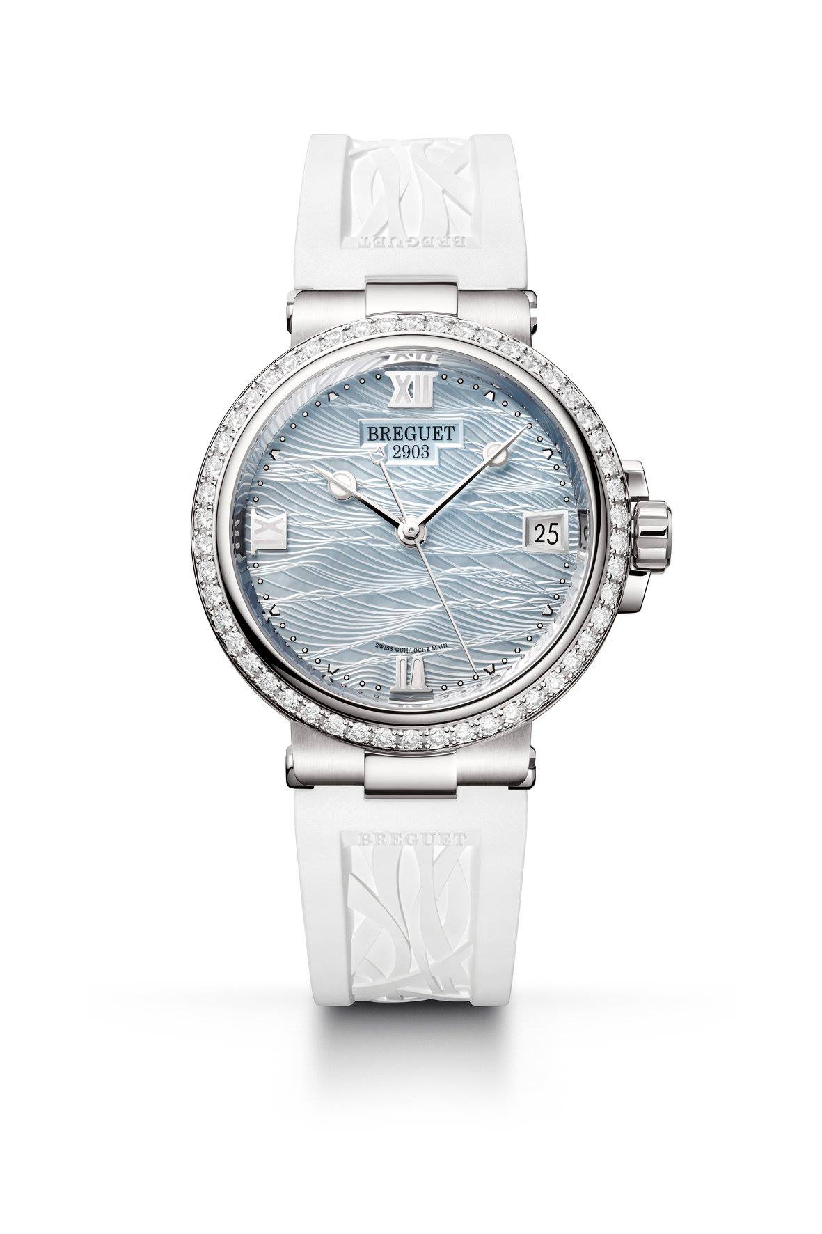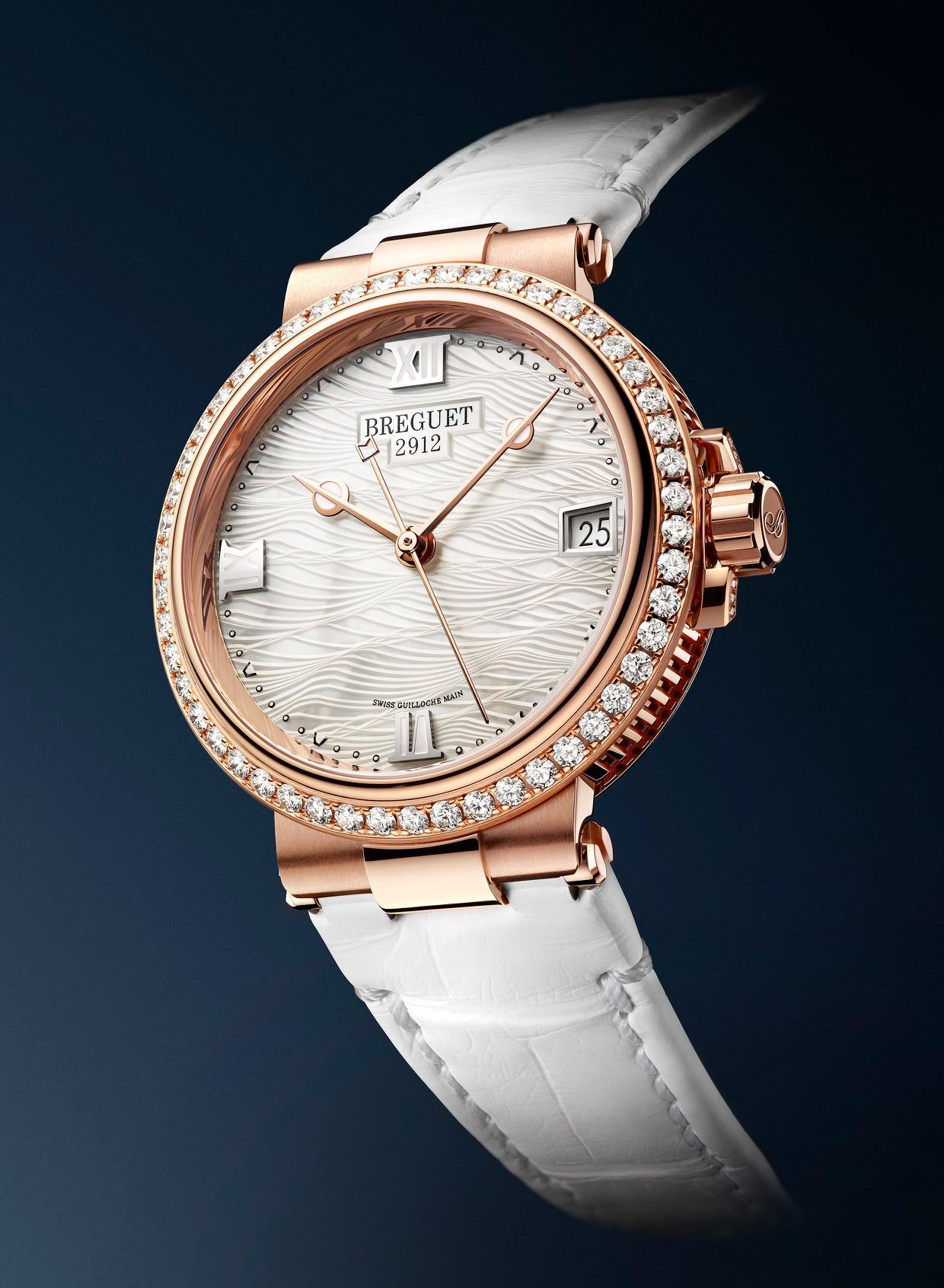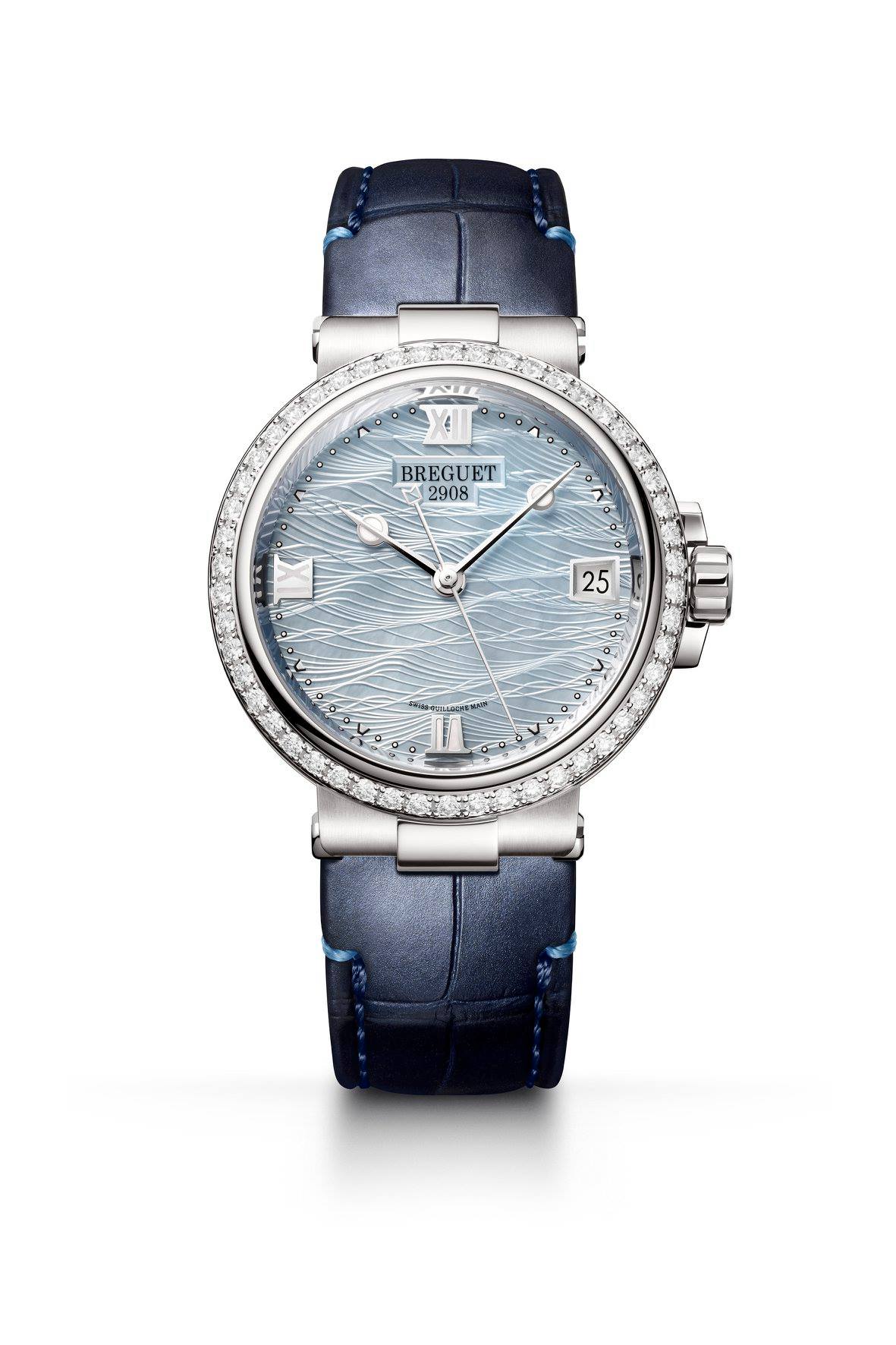 La Maison Breguet propone el Marine en versiones de acero y acero engastado, particularmente adaptadas a un uso deportivo. La carátula de estos modelos se viste de nácar opalino natural o de laca azul jaspeada, y está animada con volutas más claras que evocan las olas espumosas o un cielo estrellado, punto de referencia de los navegantes de antaño.