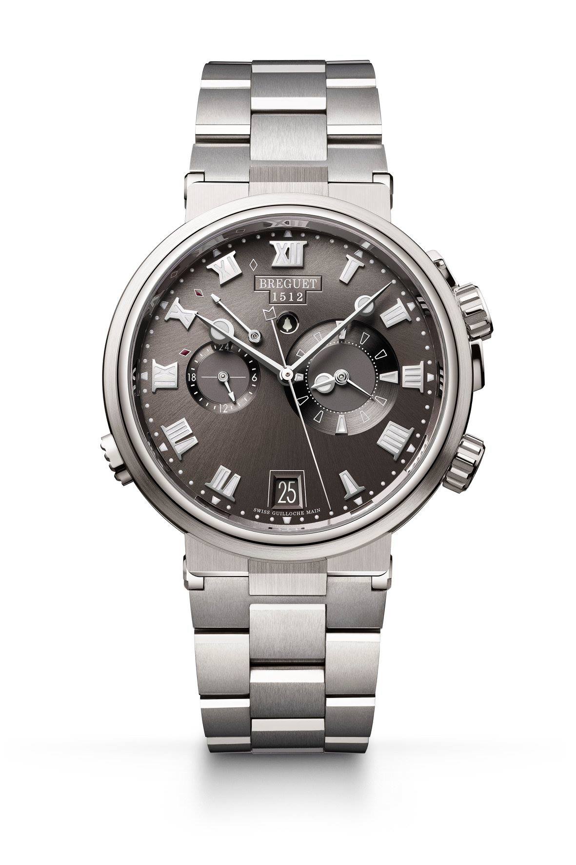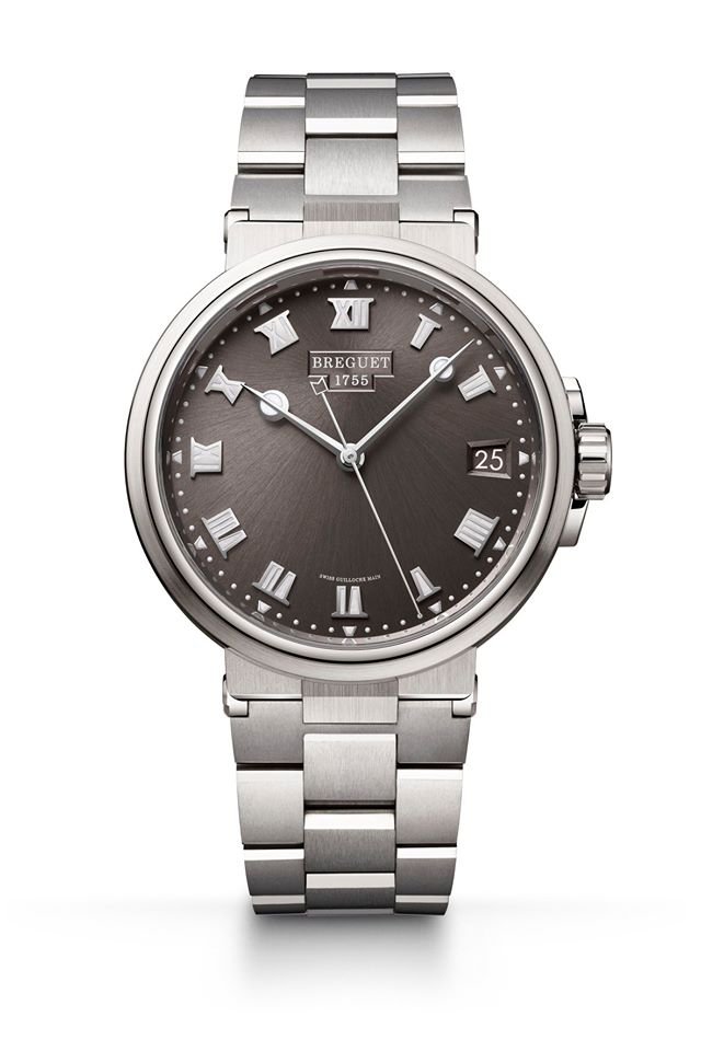 La sobriedad de estos matices de gris destaca el carácter contemporáneo del Marine. Muchos detalles de la colección, inspirados en el mundo de la navegación, evocan el título de Relojero de la Marina real francesa otorgado a Abraham-Louis Breguet en 1815. Siempre en busca de la fiabilidad absoluta, la Maison equipa los modelos Marine con calibres de manufactura de carga automática cuya precisión está controlada en 6 posiciones distintas. El Marine 5517 con visualización de la fecha palpita al ritmo del calibre 777A, mientras que el Marine Chronographe 5527 adopta el calibre 582QA. Por su parte, el Marine Alarme Musicale 5547 integra el calibre 519F, con función despertador, un segundo huso horario y la fecha.