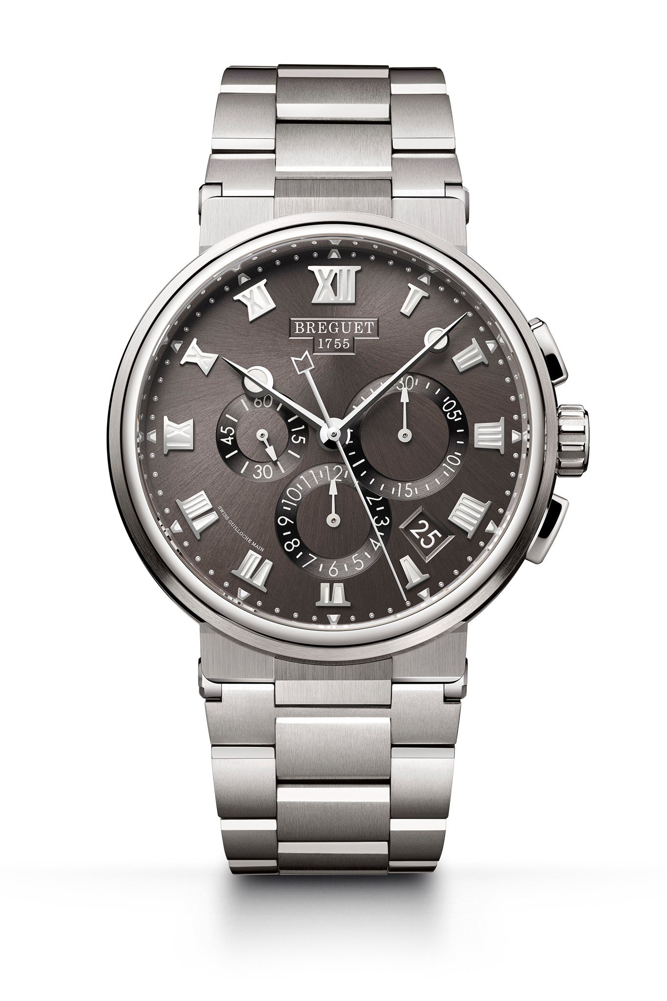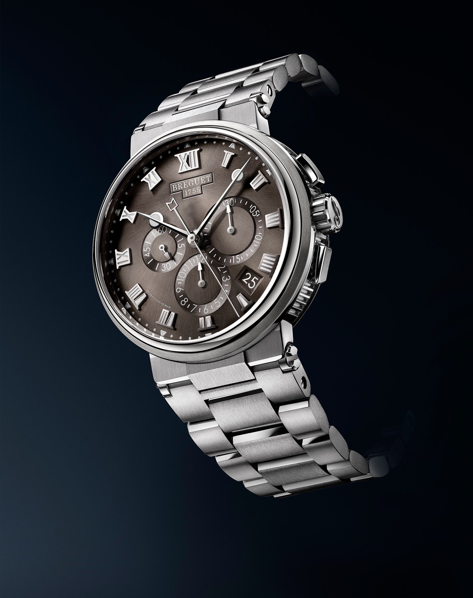 Los tres modelos de la colección Marine disponibles en titanio se ofrecen ahora con brazaletes del mismo material, resistente y ligero. Breguet asocia el titanio con una carátula pizarra soleada de oro.