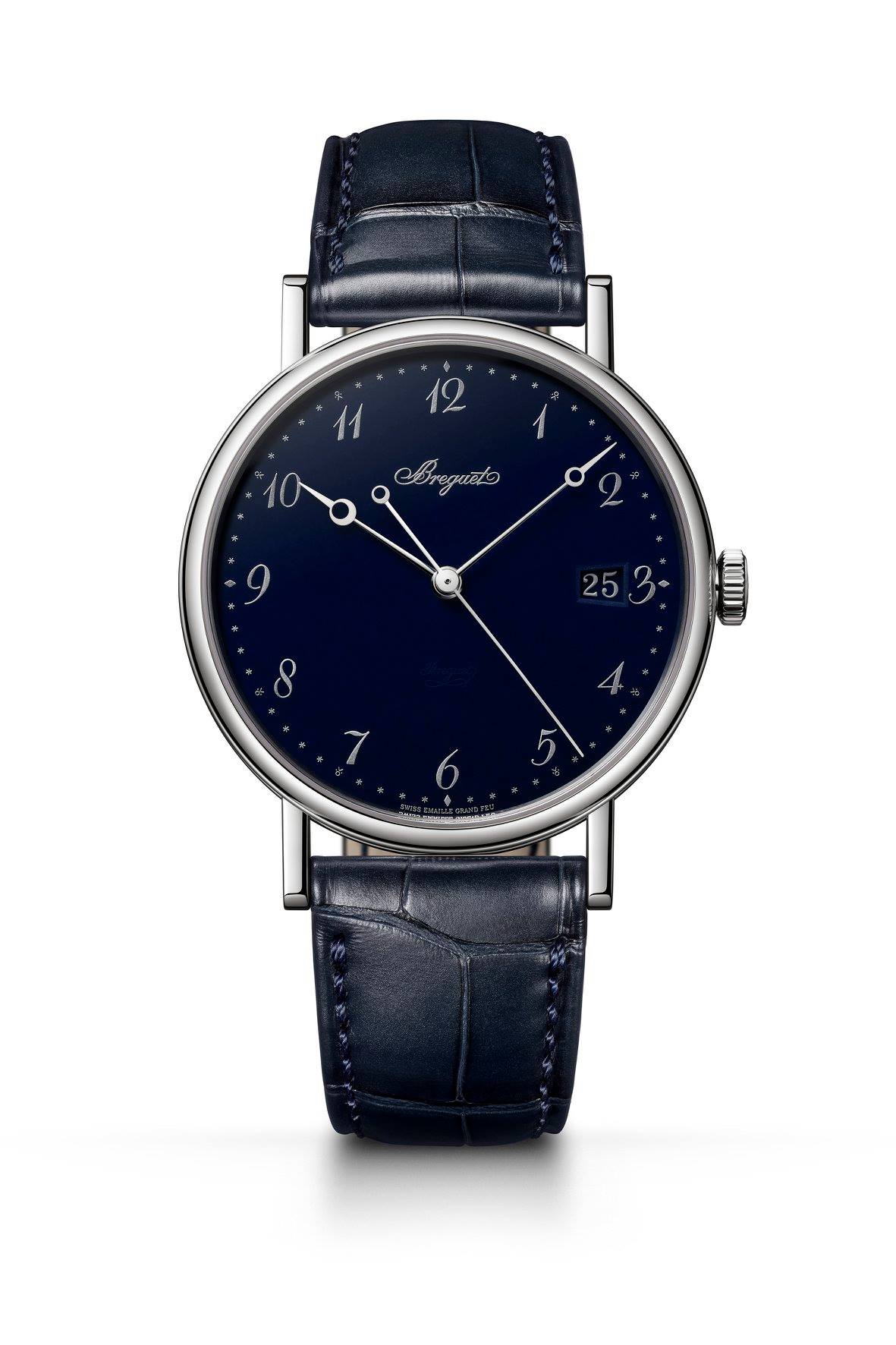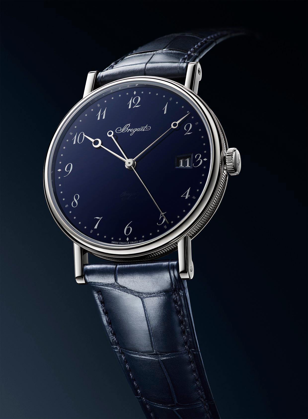 Conservando el toque clásico, la Maison sigue utilizando la caligrafía diseñada por su fundador Abraham-Louis Breguet. Dotado de un calibre mecánico de carga automática 777Q, el Classique 5177 Émail Bleu Grand Feu tiene funciones como: segundero central y fecha que se visualizan dentro de una caja redonda de oro blanco de 18 quilates con carrura finamente acanalada que protege un cristal de zafiro.