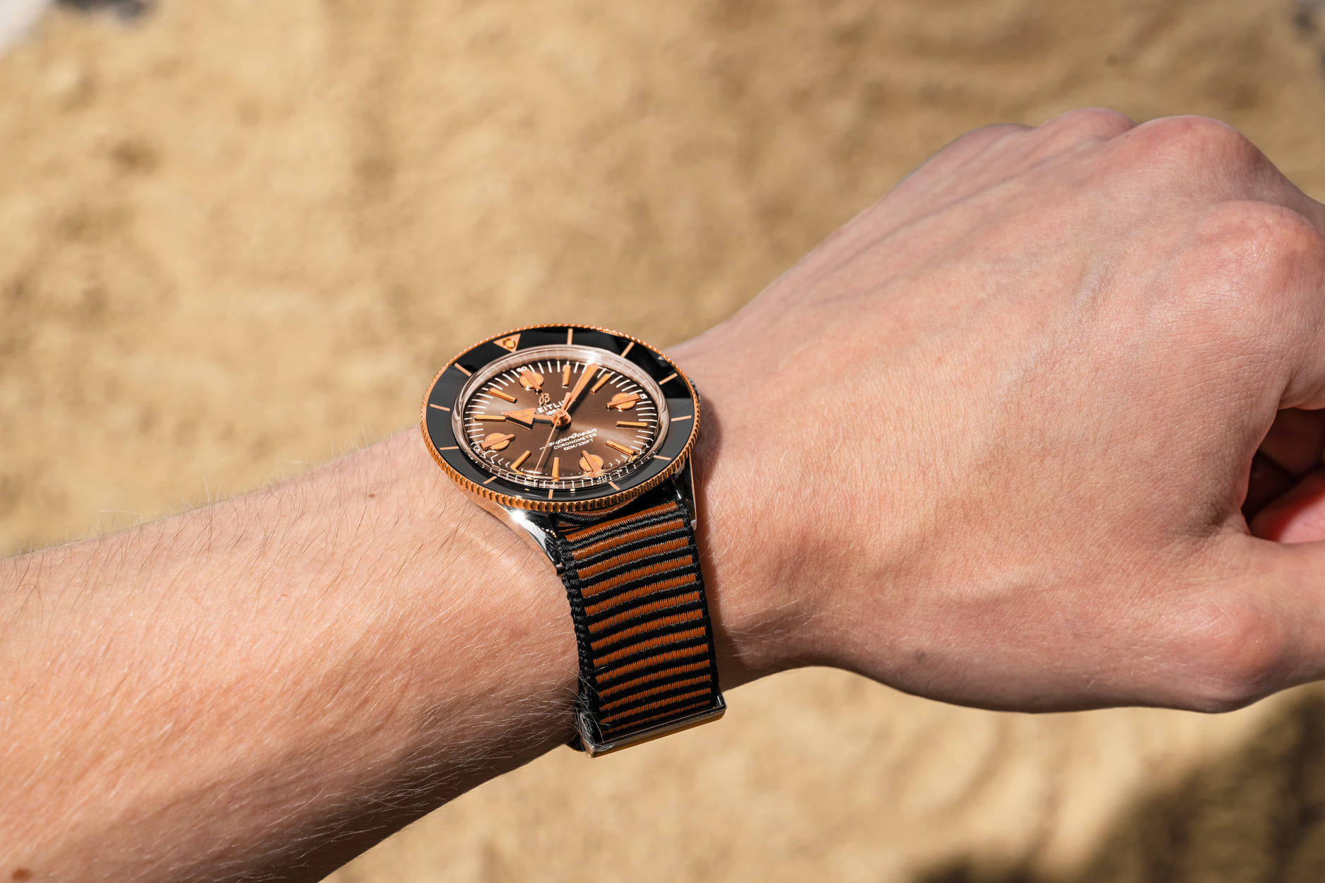 Estéticamente lucen una carátula color bronce para dar el toque vintage, mientras que la correa de NATO marrón de hilo Econyl® Outerknown es preciosa y combina con el diseño general de la pieza. El bisel giratorio de acero inoxidable cuenta con un anillo cerámico resistente a arañazos y choques, con un punto central luminiscente a las 12 horas como característica de reloj de buceo.