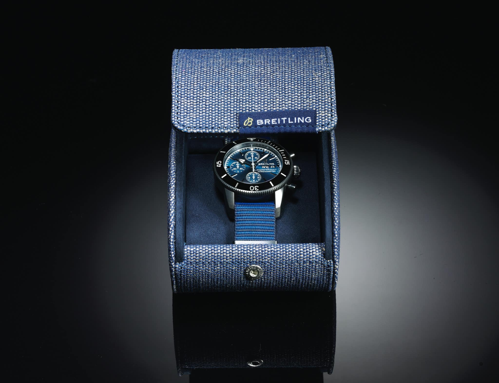 Con el Superocean Héritage II Chronograph 44 Outerknown, Breitling presenta por primera vez un reloj con una correa hecha de materiales reciclados. Cada reloj presenta una correa NATO hecha de hilo ECONYL®, un material de nailon regenerado creado a partir de desechos de nailon, una de las cuales son las redes de pesca de los océanos de todo el mundo. La asociación con Outerknown también inspiró el patrón de la correa, que se basa en una tela producida por la empresa de ropa. El color de la correa, tafetán azul oscuro, refleja la conexión de este extraordinario reloj con los océanos. El Superocean Héritage II Chronograph 44 Outerknown también se presenta en un embalaje fabricado íntegramente con materiales reciclados.
