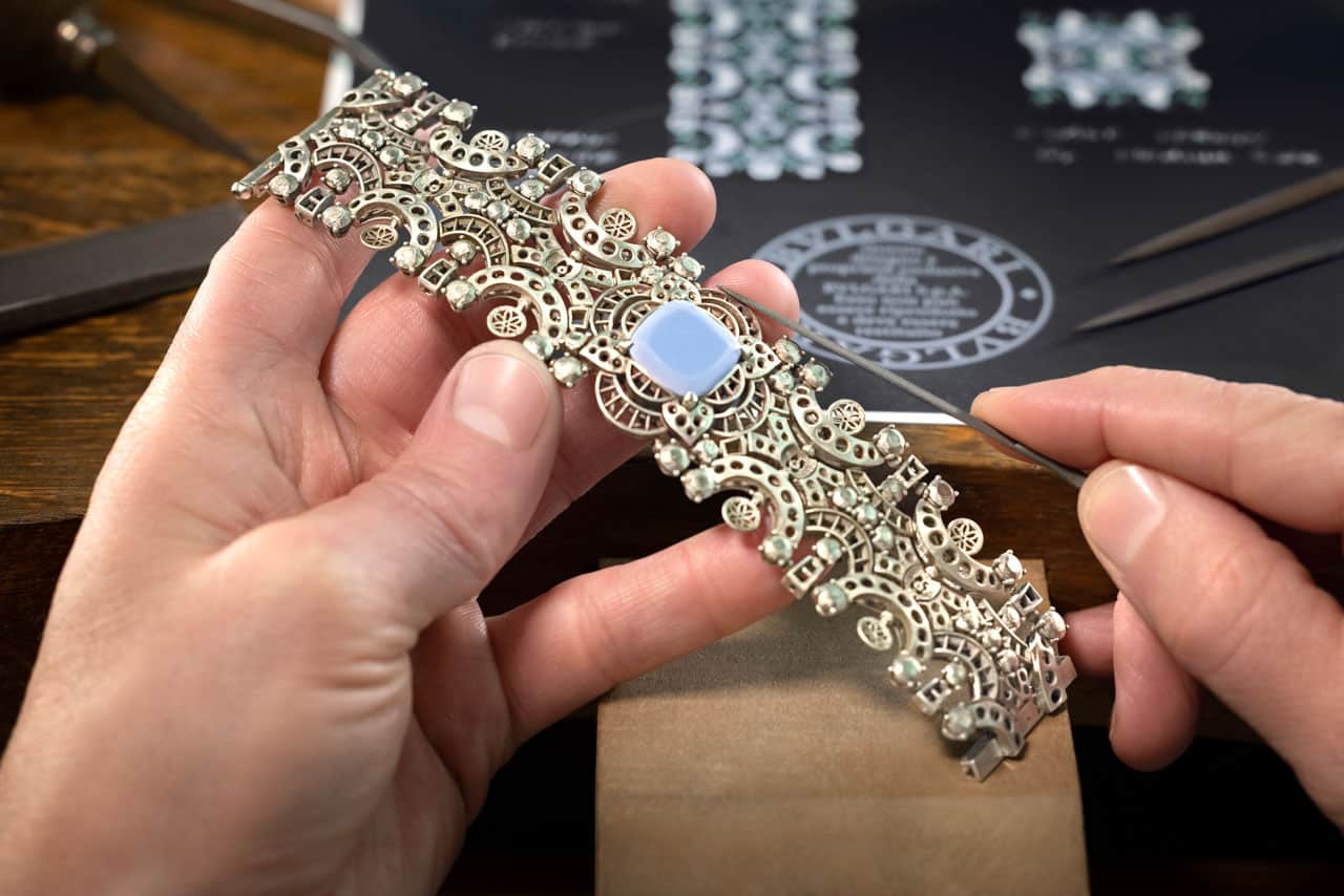Las piedras parecen flotar en el aire gracias al uso de la técnica fil couteau, que permite mantener unidos los elementos a través de finos hilos de oro. El resultado es una pulsera muy flexible y extremadamente cómoda de llevar.