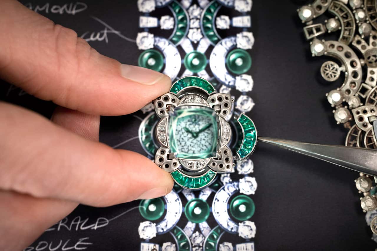 Este reloj extraordinario requirió 900 horas para ser elaborado y en él trabajaron cinco artesanos diferentes. Su carátula en oro blanco es visible a través de una turmalina verde-menta facetada, una piedra transparente que permite leer la hora en transparencia.